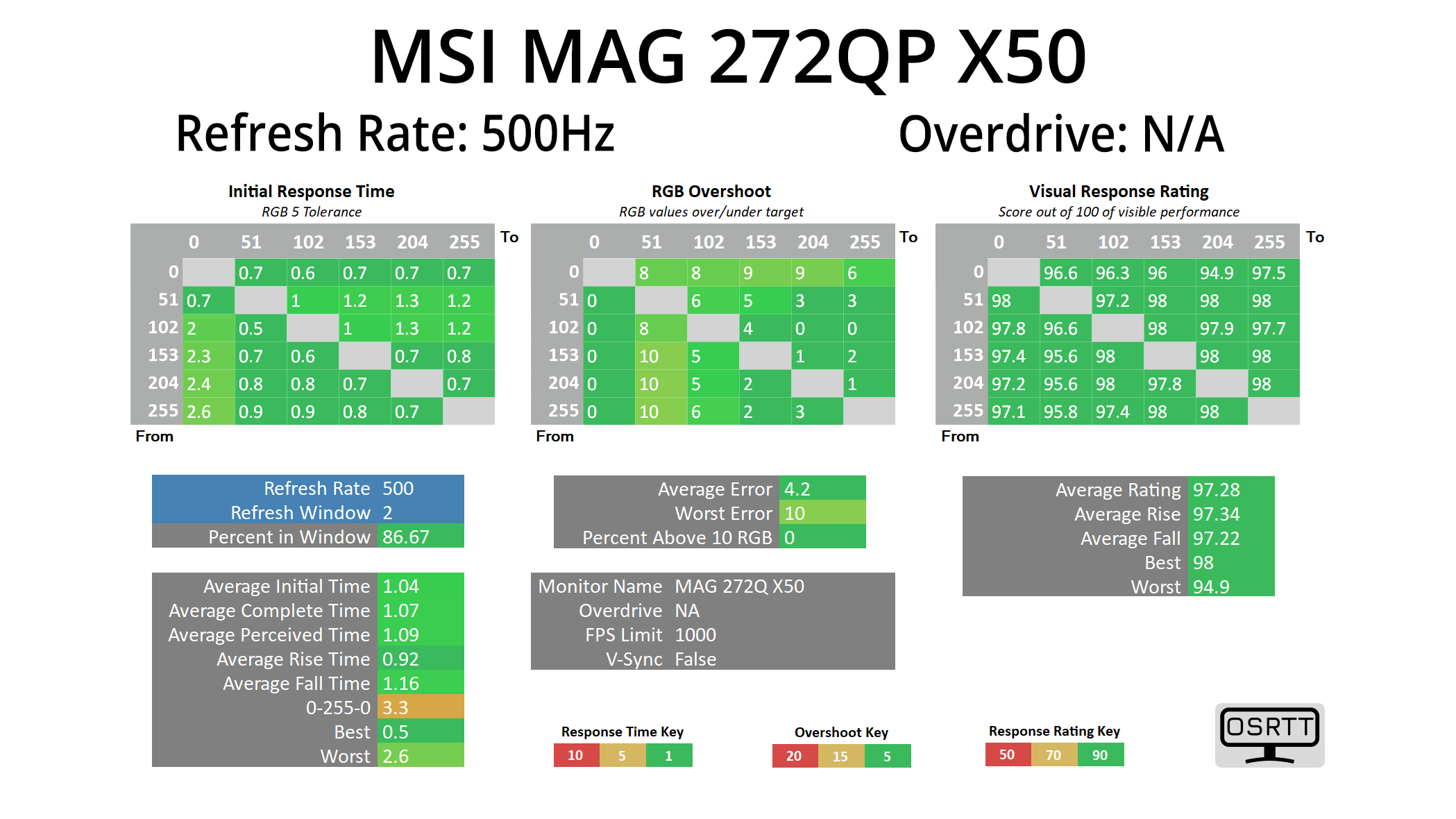 We use the Open Source Response Time Tool (OSRTT), developed by TechTeamGB, for our response time testing. This measures grey-to-grey response times and presents the results in a series of heatmaps, the style of which you may be familiar with from other reviews.