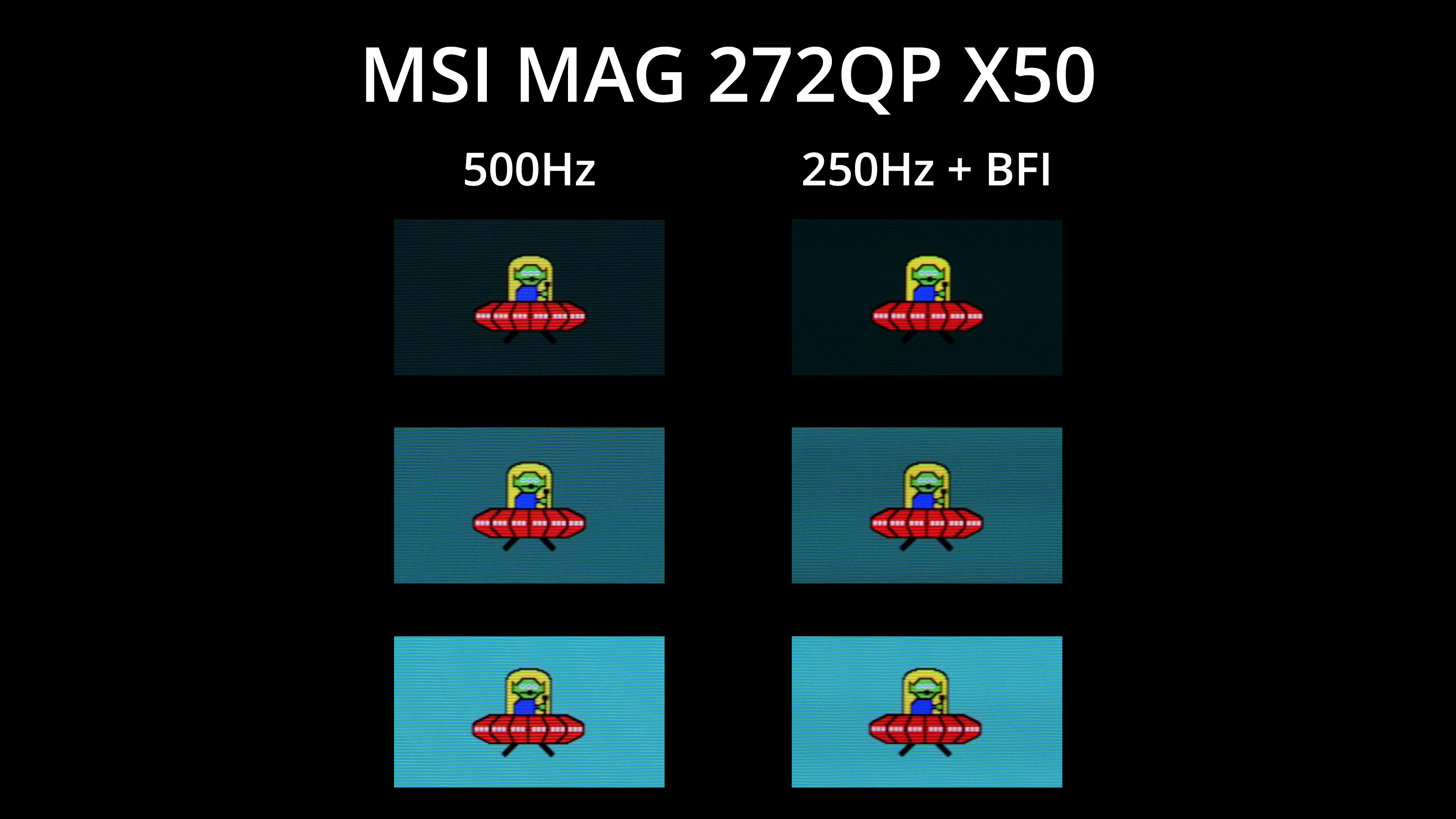 You might be thinking that 500Hz sounds good and all, but if you can't hit frame rates up to 500fps, then what's the point? Thankfully MSI has included a new MPRT mode – AKA black frame insertion (BFI) – which places a black frame after every regular frame. This means that, with it enabled, you get broadly equivalent motion clarity at 250Hz as you would without BFI at 500Hz, and it's obviously a lot easier to drive games at 250fps! It does disable adaptive sync and brightness is capped at 152 nits max, but it could be well worth using depending on the games you play.