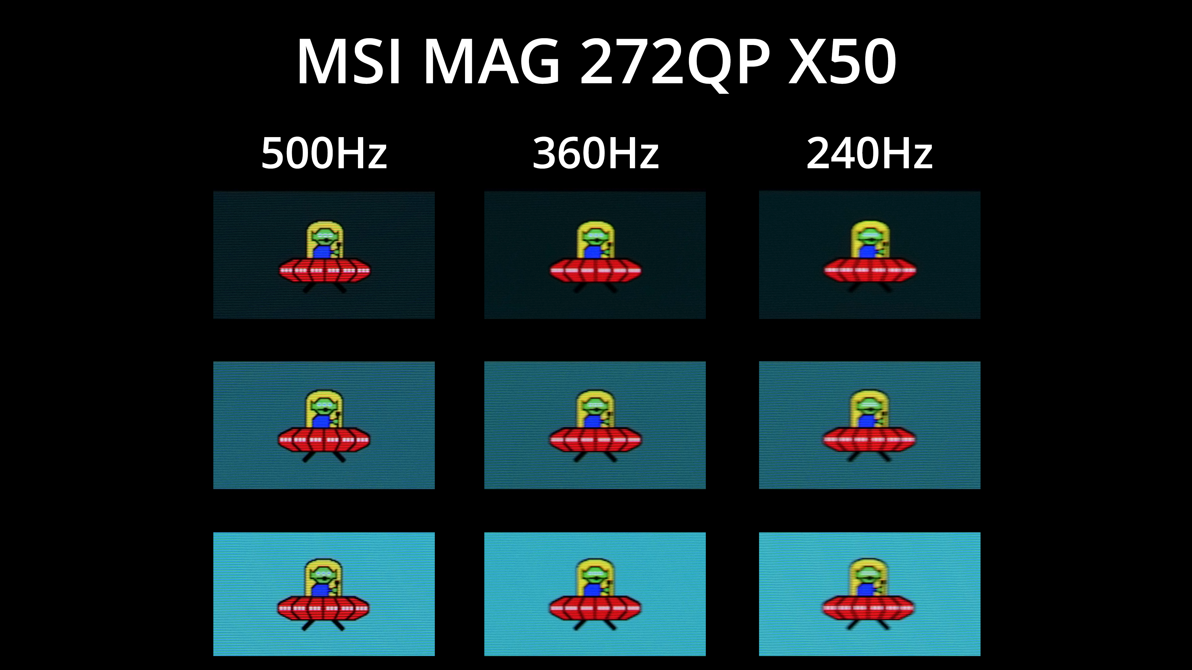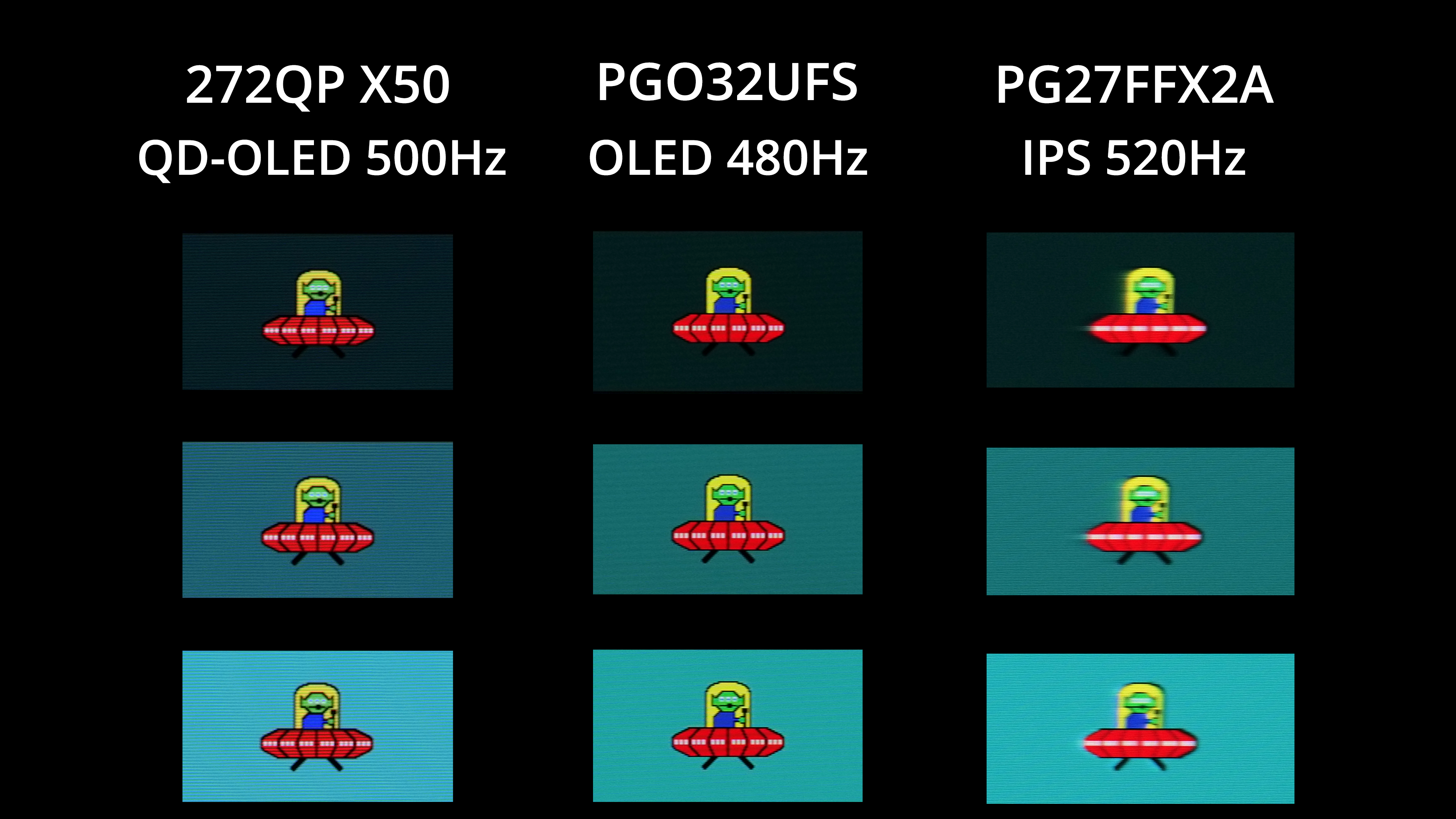 Of course, that doesn't mean motion clarity is the same at different refresh rates, and I was really intrigued to see what visual benefit 500Hz would offer over the previous 360Hz QD-OLED panels. As you can see, it's not a night-and-day difference, but I'd say there's a definite improvement to clarity – the white dots on the UFO are now less blurred, for instance, as are the alien's three eyes. Compared to 240Hz as well, the difference looks even more pronounced, so there is definitely a benefit to pushing the refresh as high as possible.