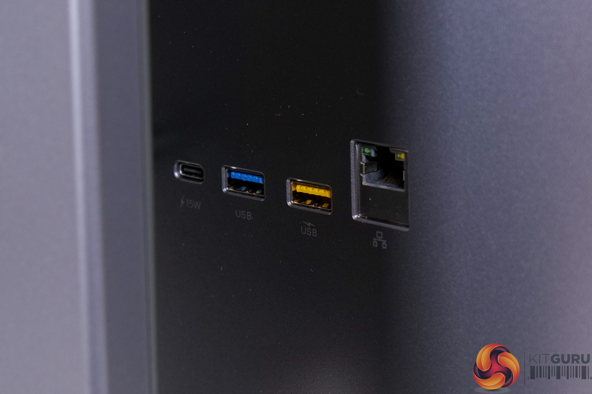 As for the connectivity options, there's one full-size HDMI 2.1 connector, one USB-C that supports DP-Alt mode and 15W power delivery, and one Type-C Thunderbolt 4 port which provides both video, data upstream and 96W power delivery. Then there's one more Type-C which is data upstream only plus 15W PD, one Type-C downstream that also offers 15W power, alongside two Type-A downstreams, with the yellow one providing fast charging support. Finally we also find a full-size Ethernet port.