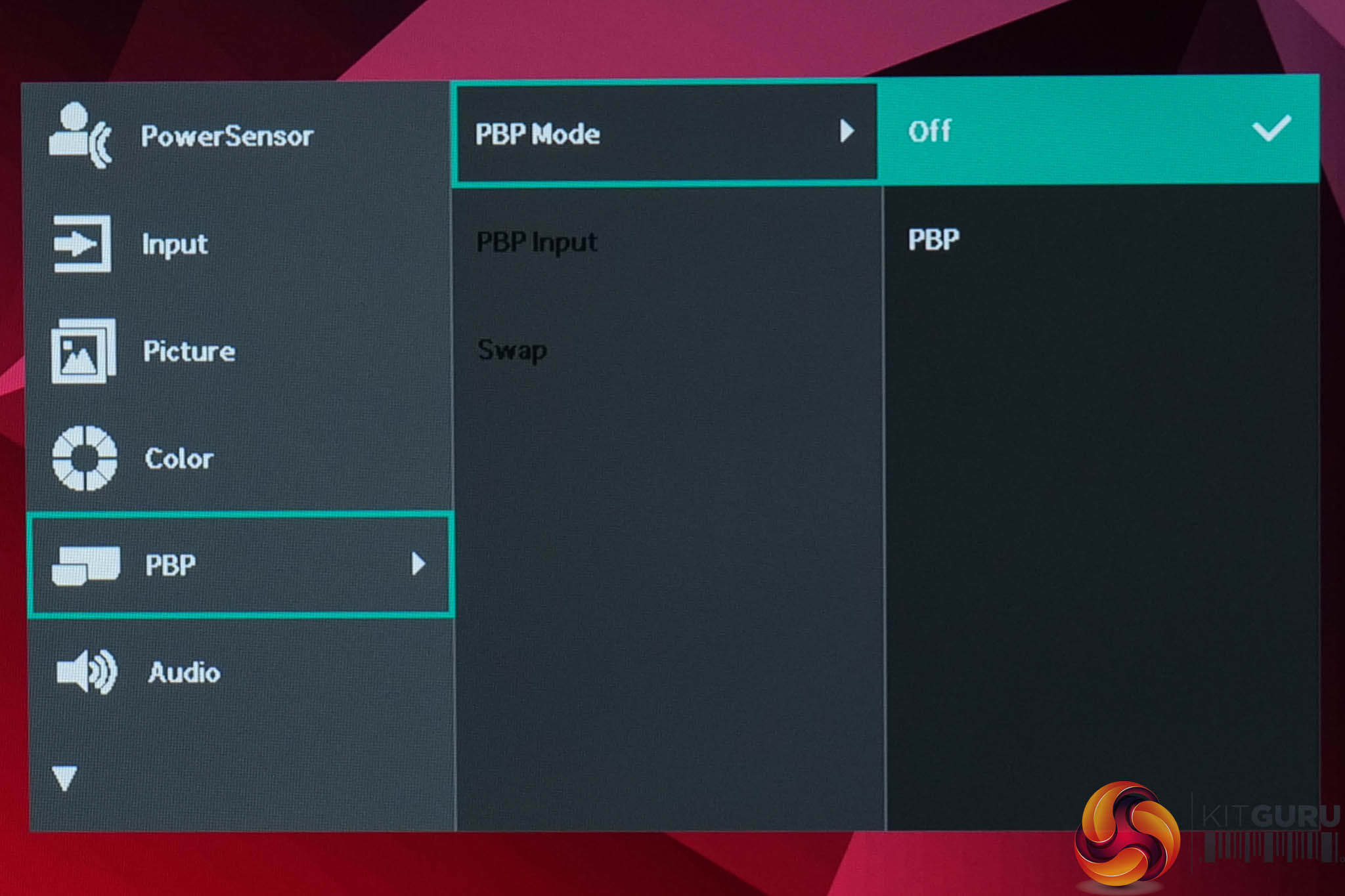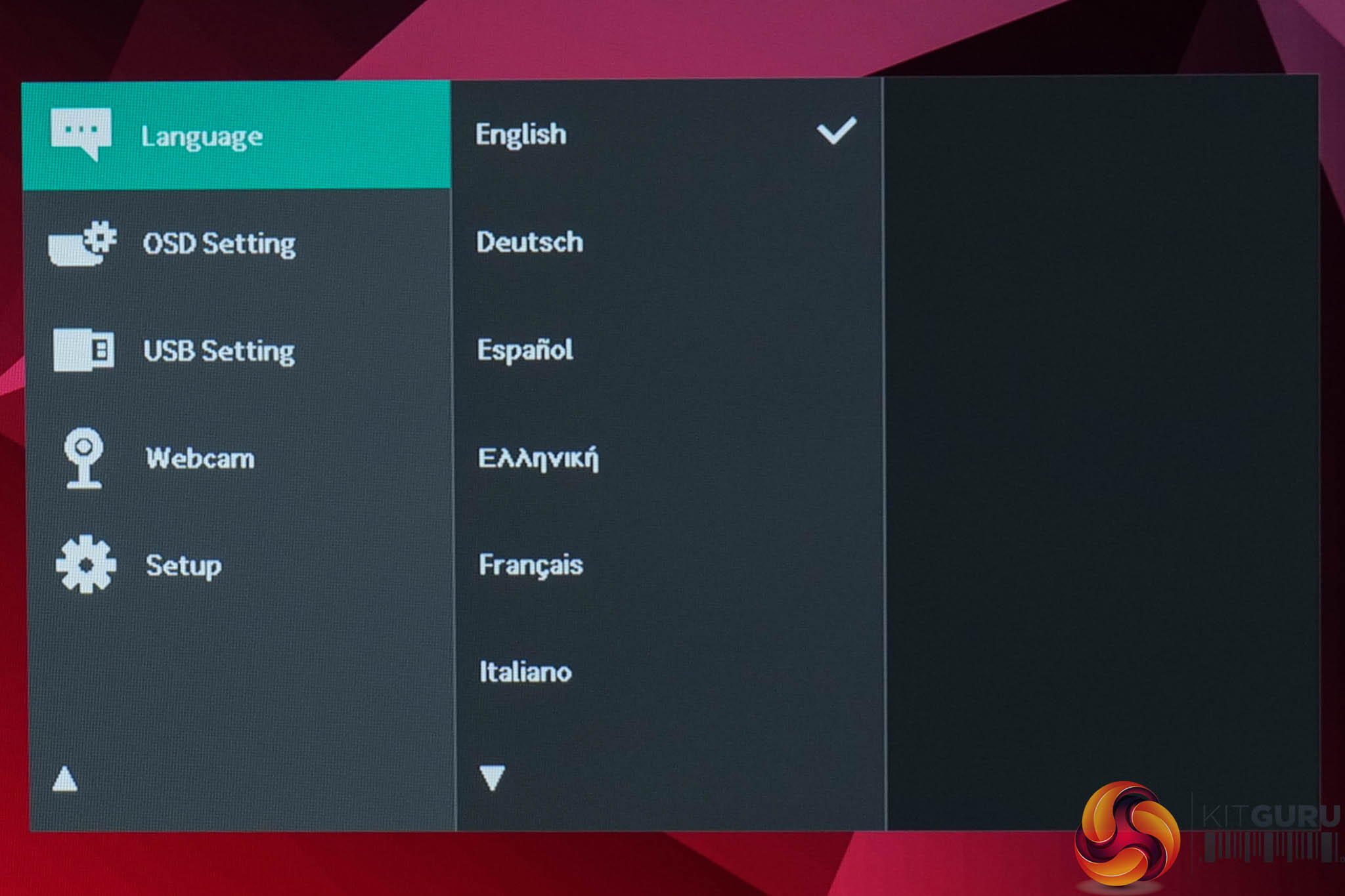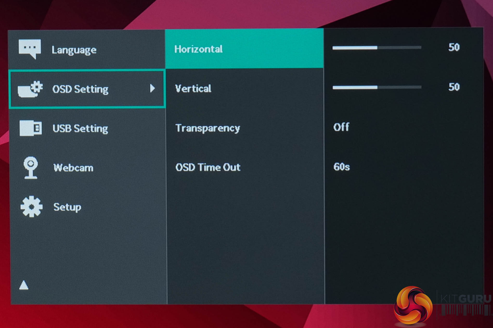 PBP allows the use of PBP/PIP functionality if you have two sources connected, while Audio gives control over the built-in 5W speakers. Language is self-explanatory, while the OSD Setting tab lets you adjust the OSD position, transparency and time-out length.