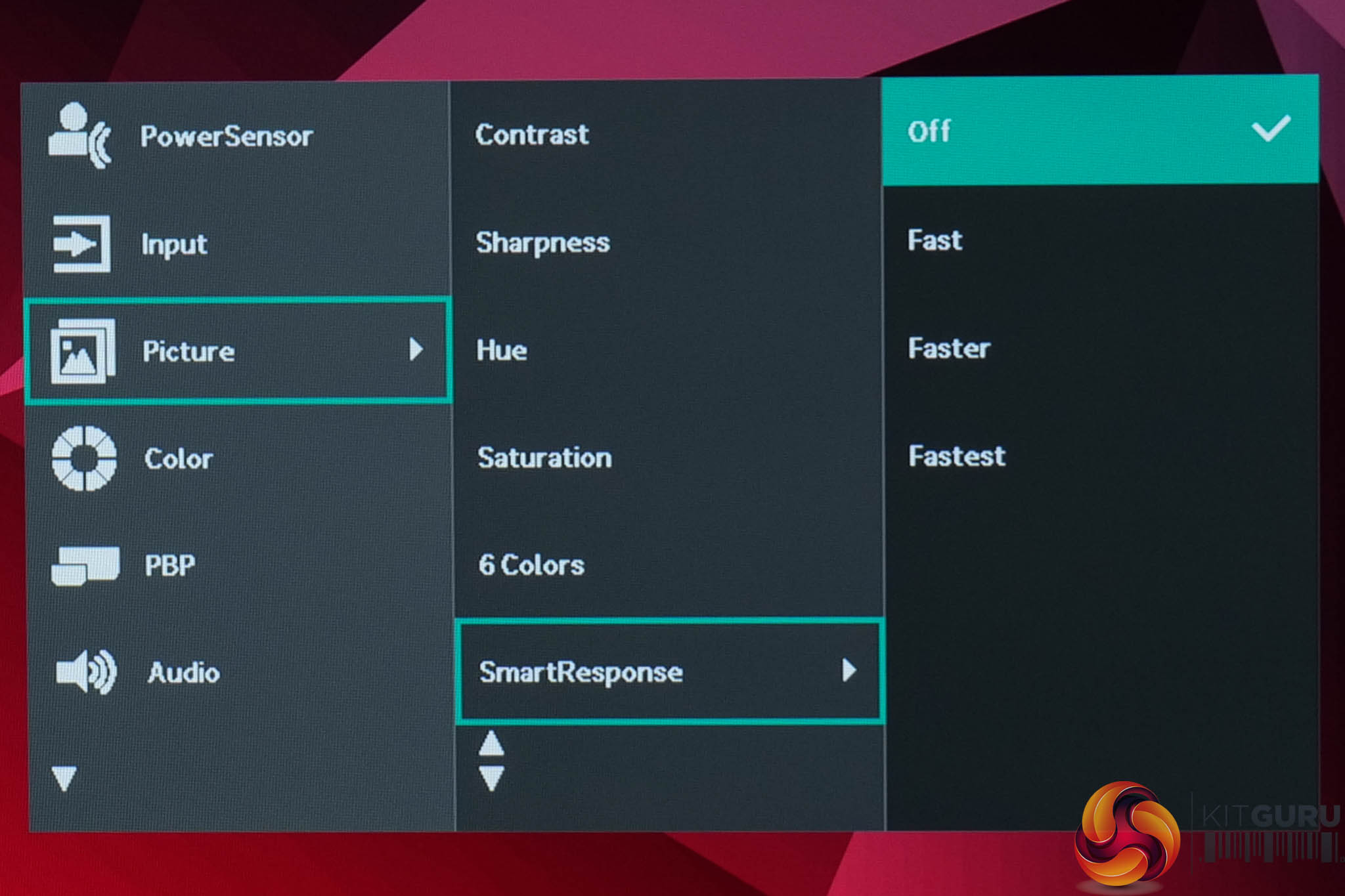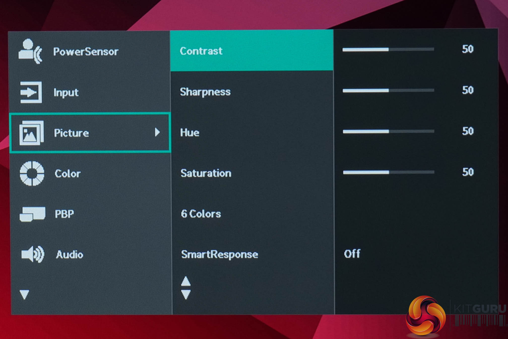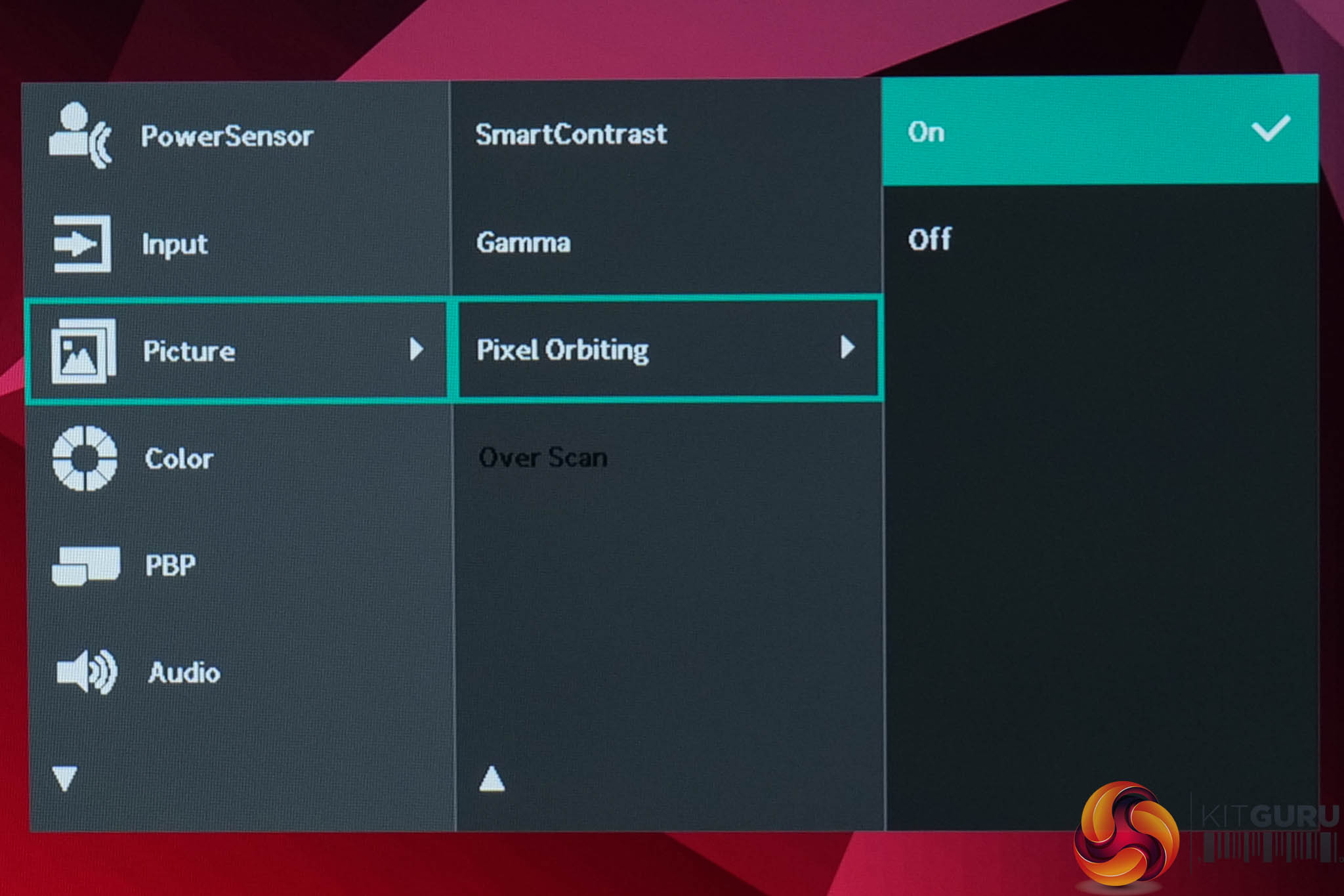 The Picture tab is extensive with a range of different settings. These include your standard brightness and contrast options, aspect ratio control, SmartResponse settings (AKA overdrive), along with gamma and Pixel Orbit functionality.