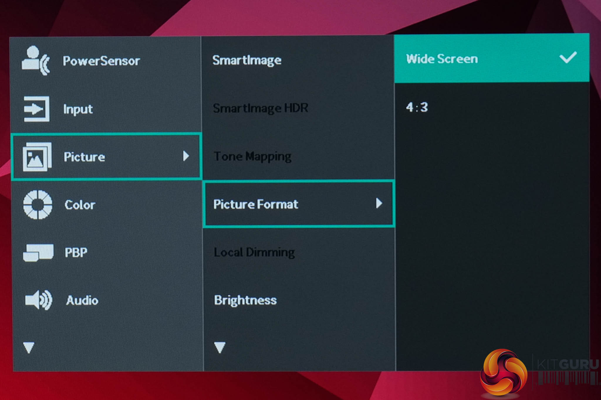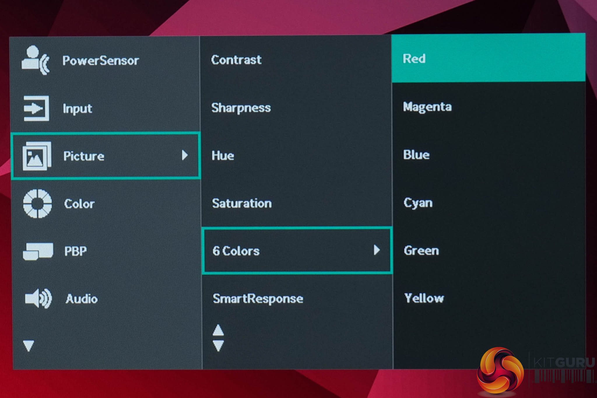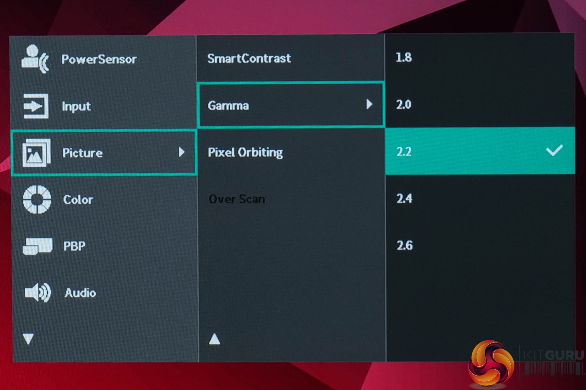 The Picture tab is extensive with a range of different settings. These include your standard brightness and contrast options, aspect ratio control, SmartResponse settings (AKA overdrive), along with gamma and Pixel Orbit functionality.