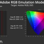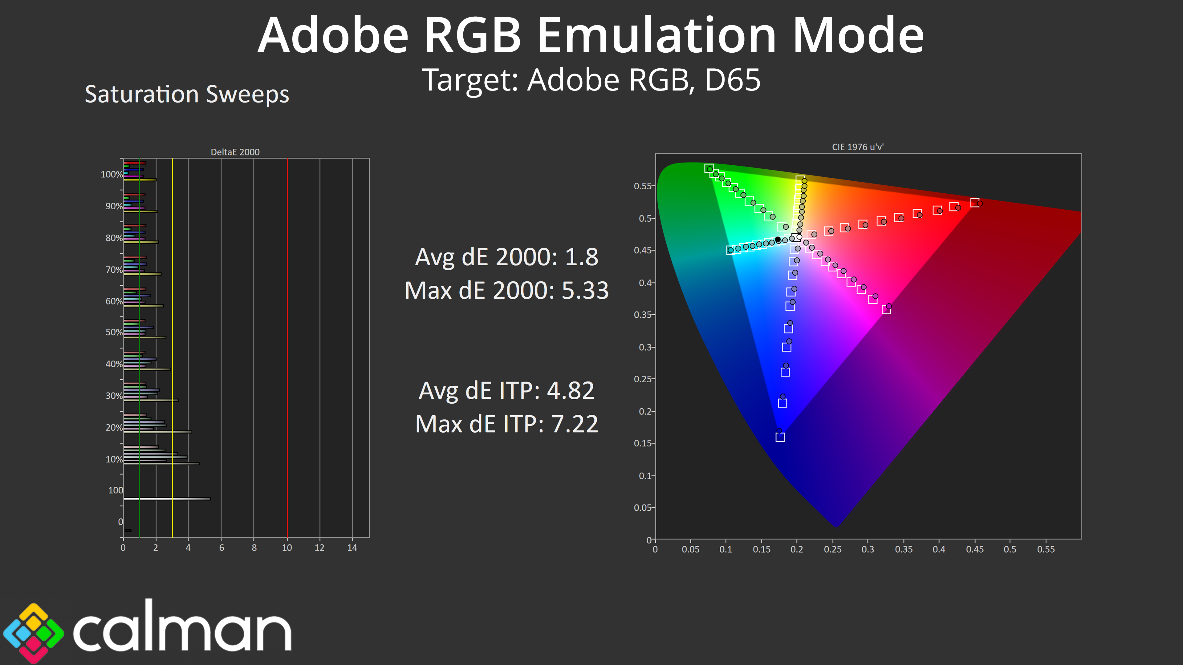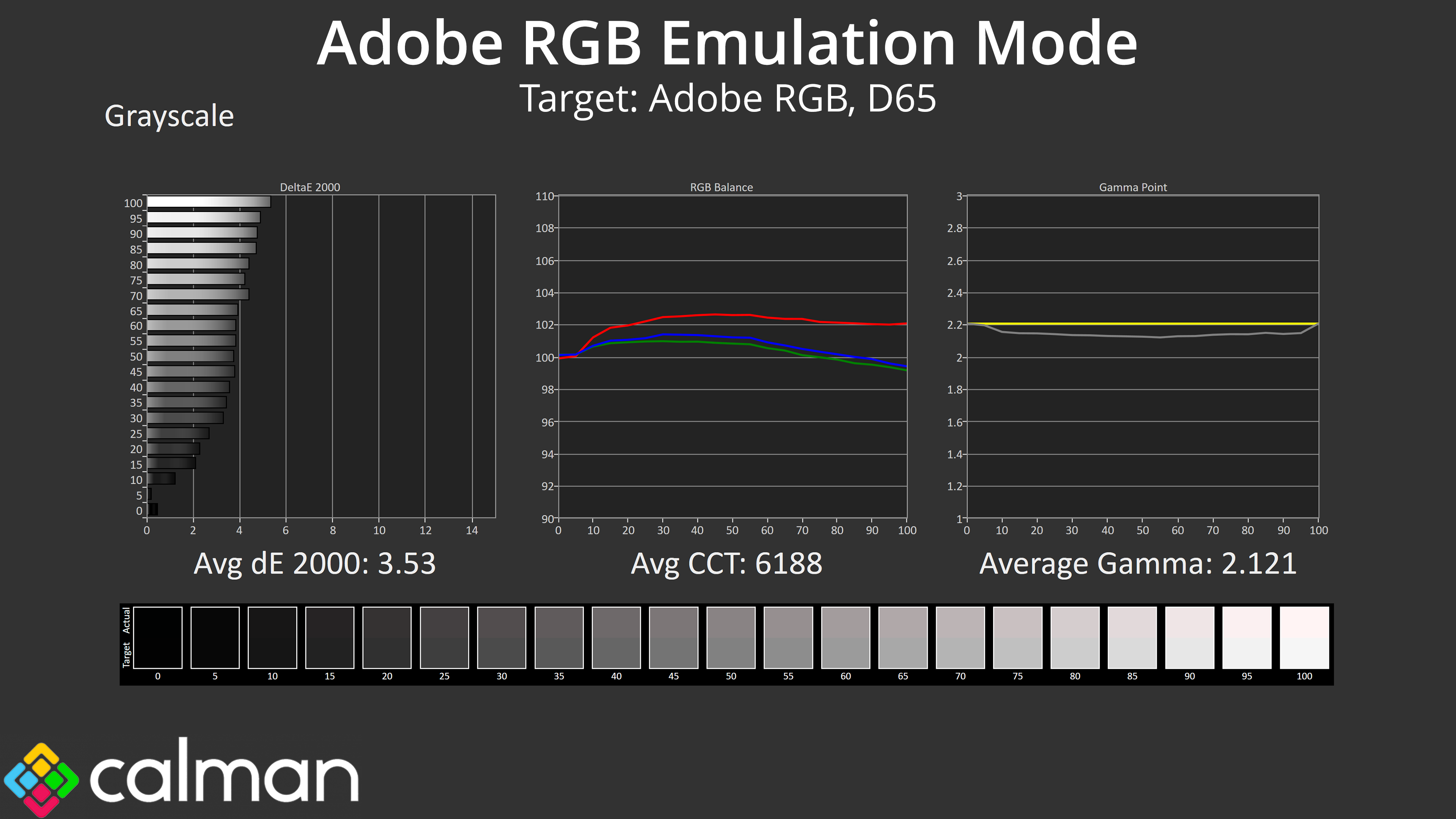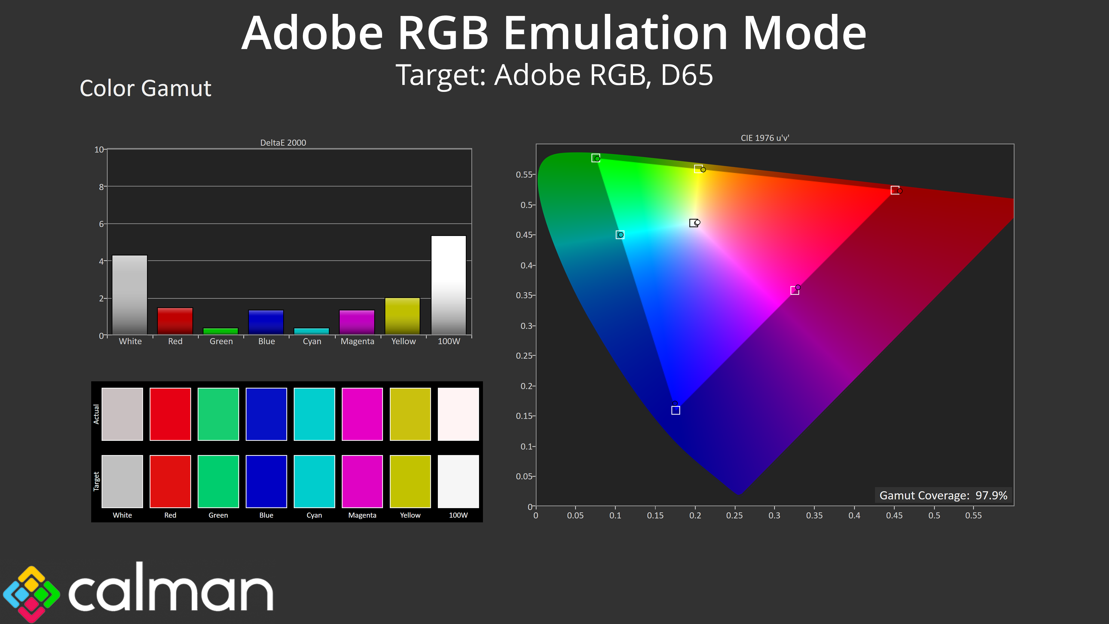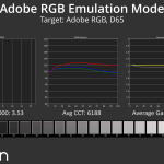 Lastly, we also tested the Adobe RGB mode. This is similar in performance overall to the DCI-P3 mode – gamma remains too low, but otherwise the saturation and colour accuracy average dEs are good without being spectacular.