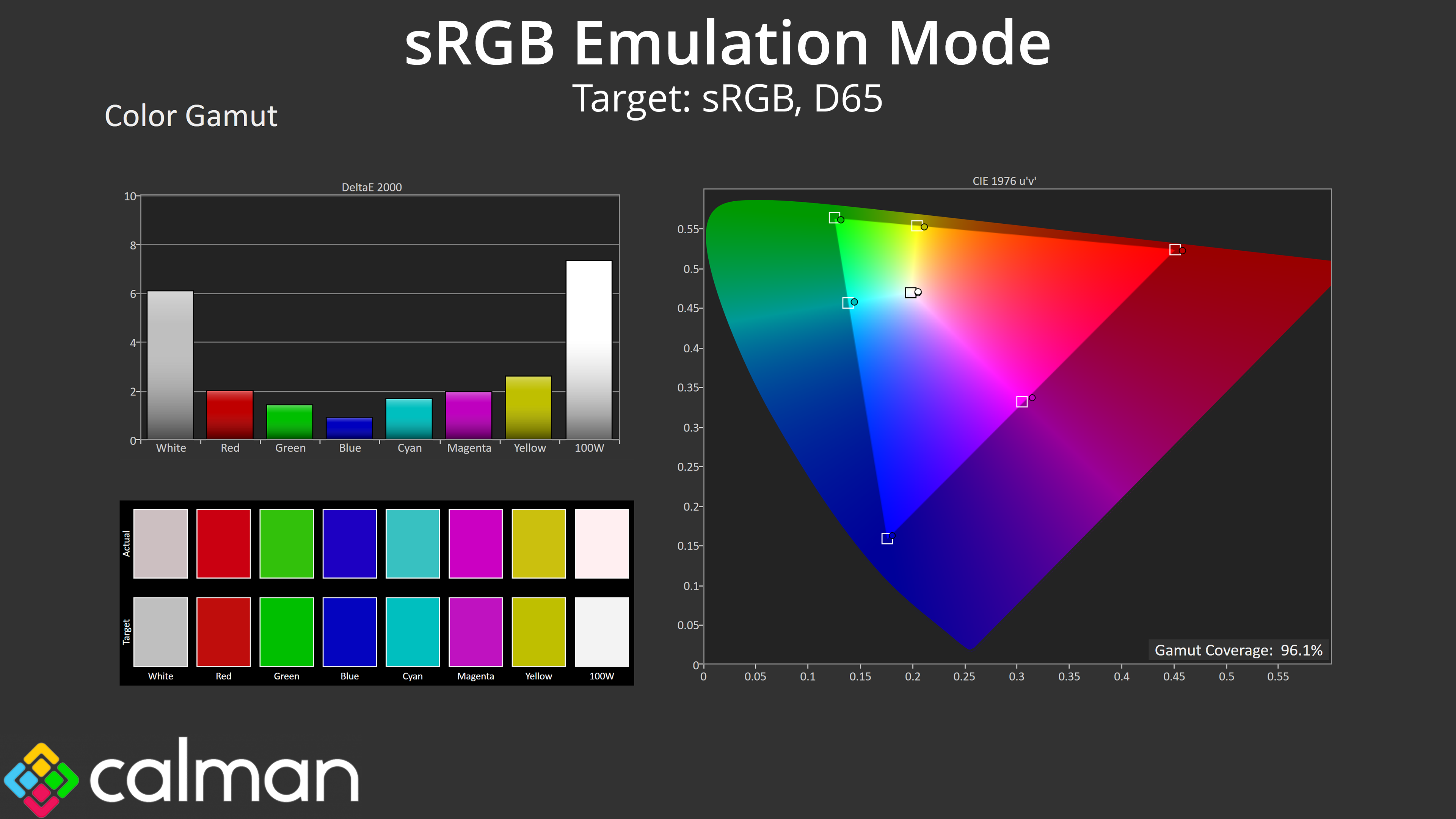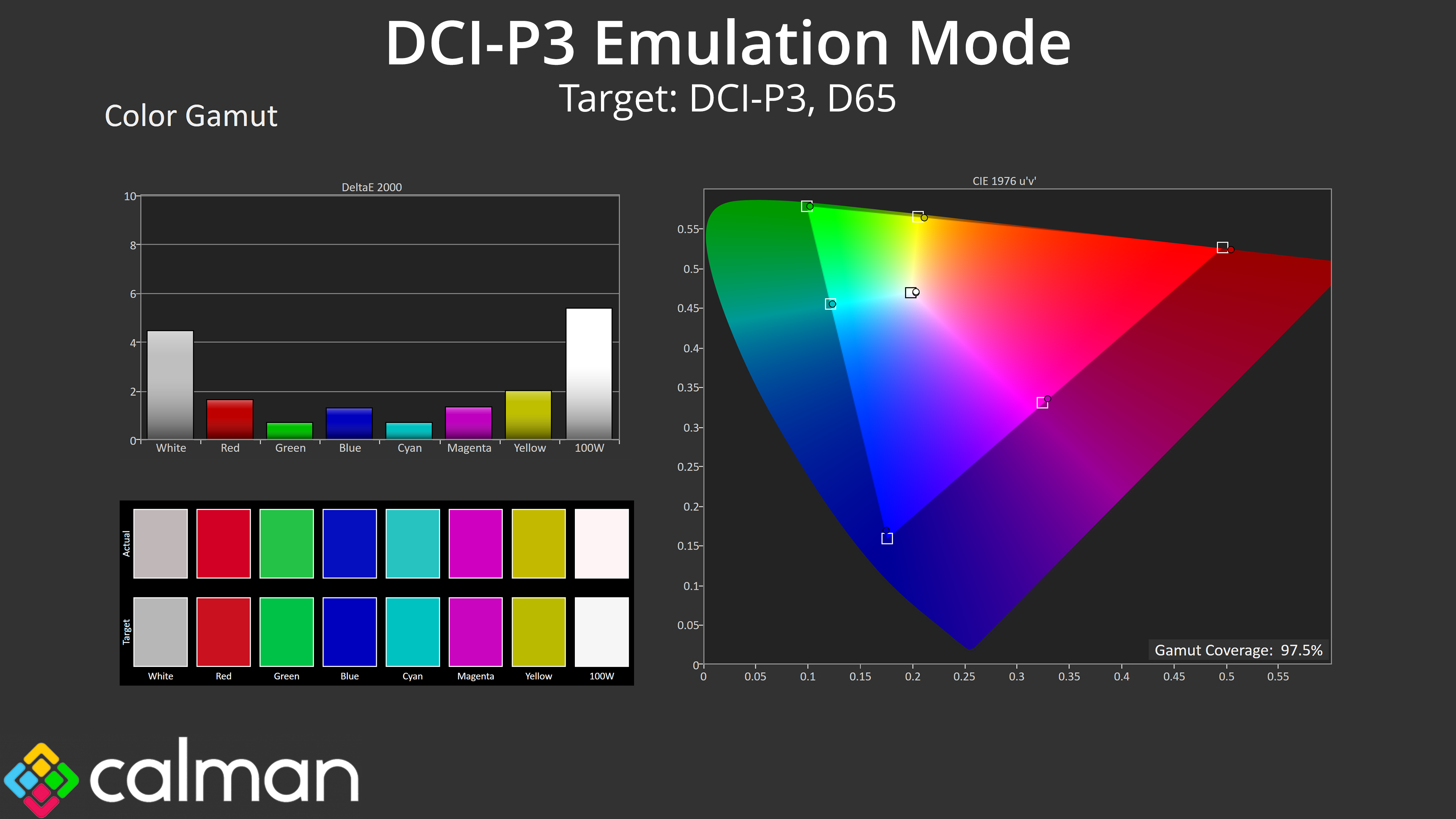 - Gamut coverage, primarily focusing on sRGB and DCI-P3 colour spaces.