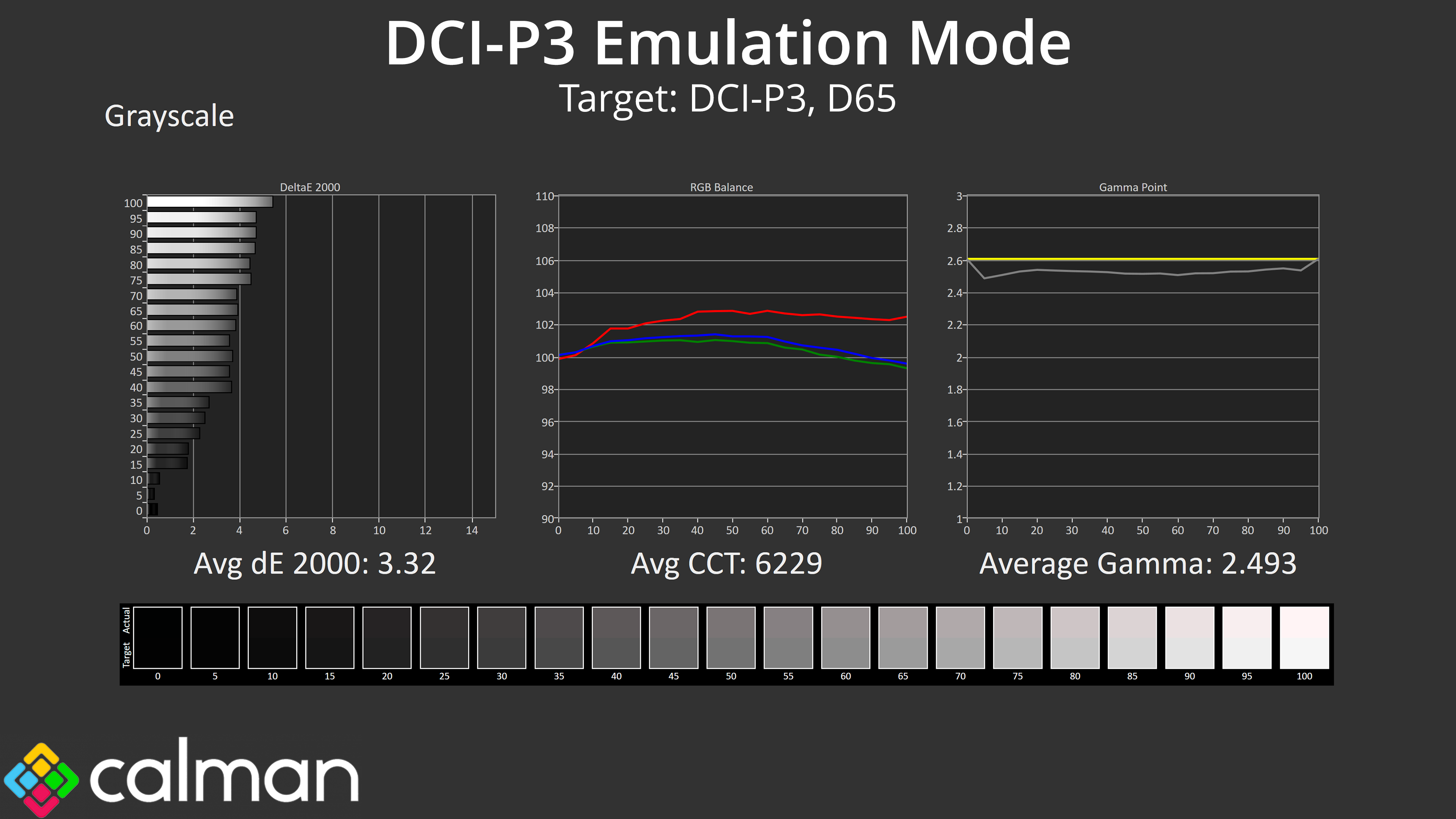 The DCI-P3 mode (not the Display P3 mode, to be clear) is a little better overall. Again it clamps the gamut well to avoid over-saturation and sees a small improvement to the overall colour balance, though gamma is still below the 2.6 target. The saturation average dE of 1.84 is more like it, and the colour accuracy result of 2.1 is also better, but still not exceptional.