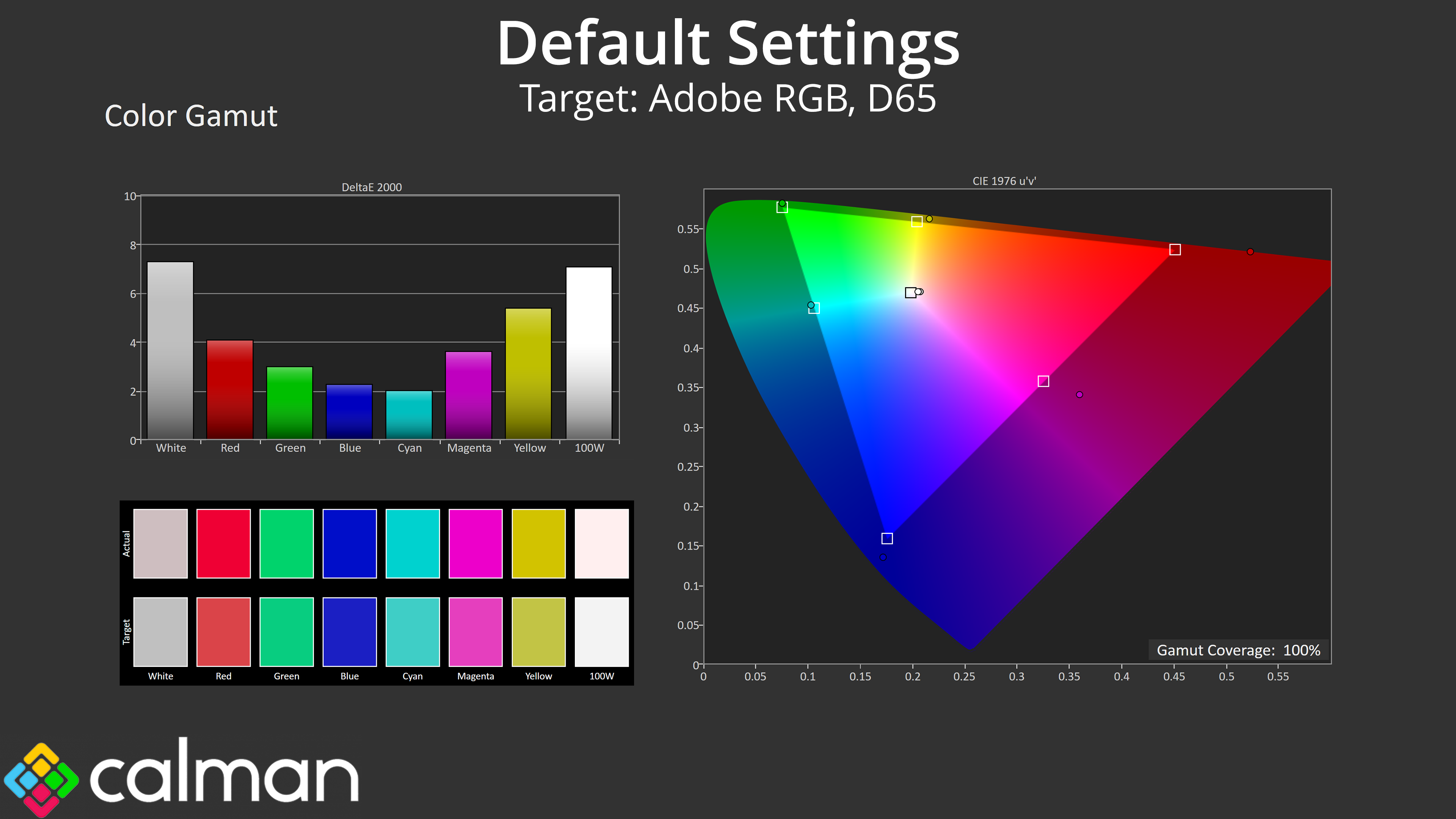 We first run these tests with the display in its out-of-the-box state, with all settings on default. If there is an sRGB emulation option or other useful mode then we may test that too. We then calibrate the screen using the Calman Ultimate software and run the tests again.