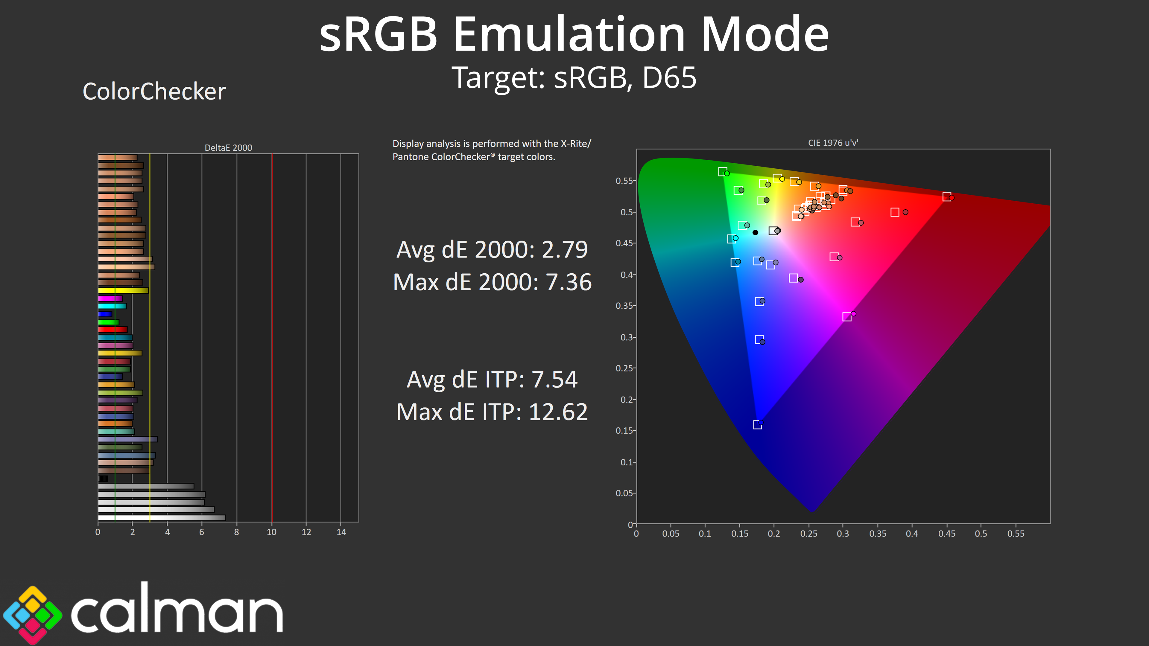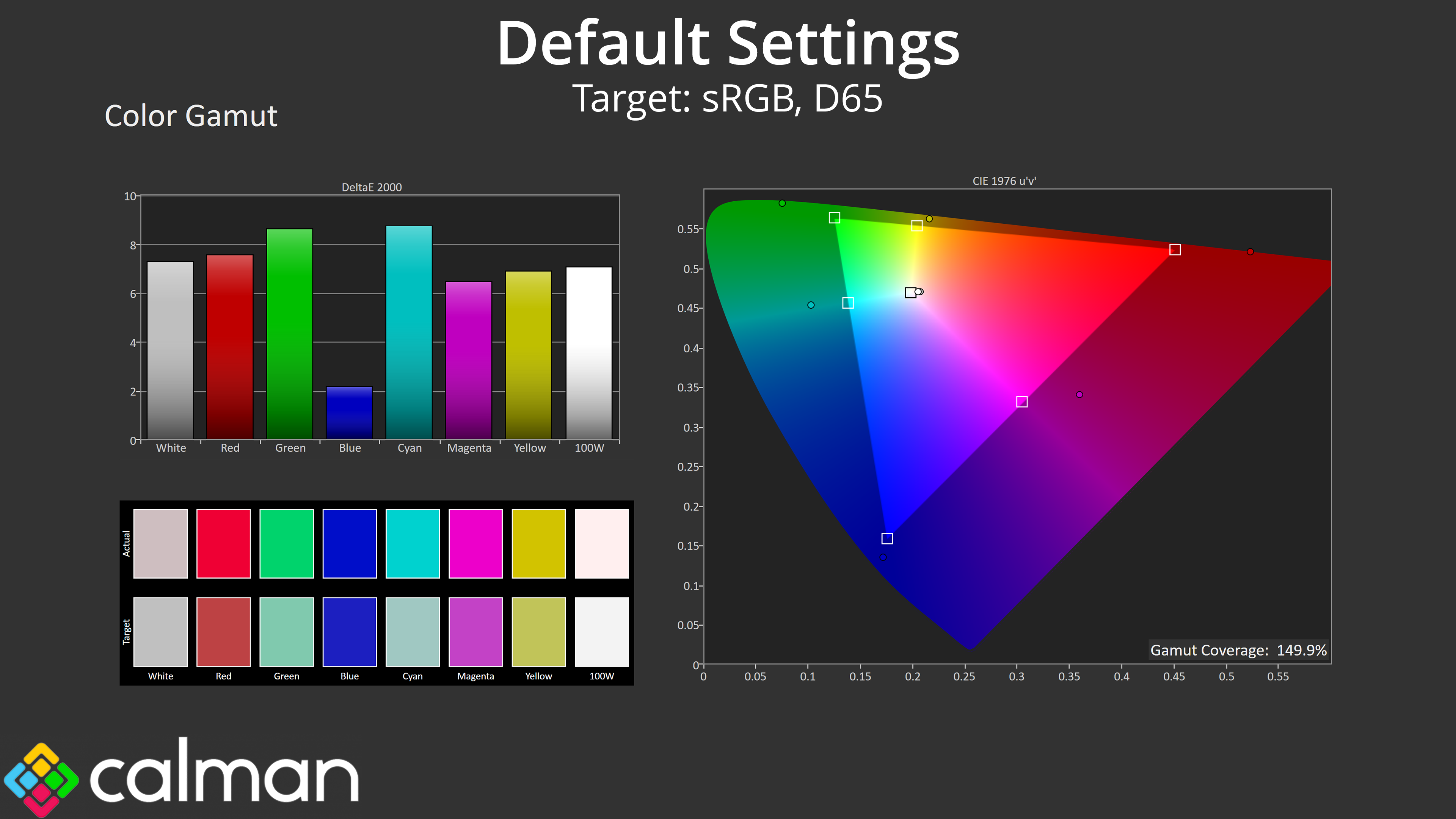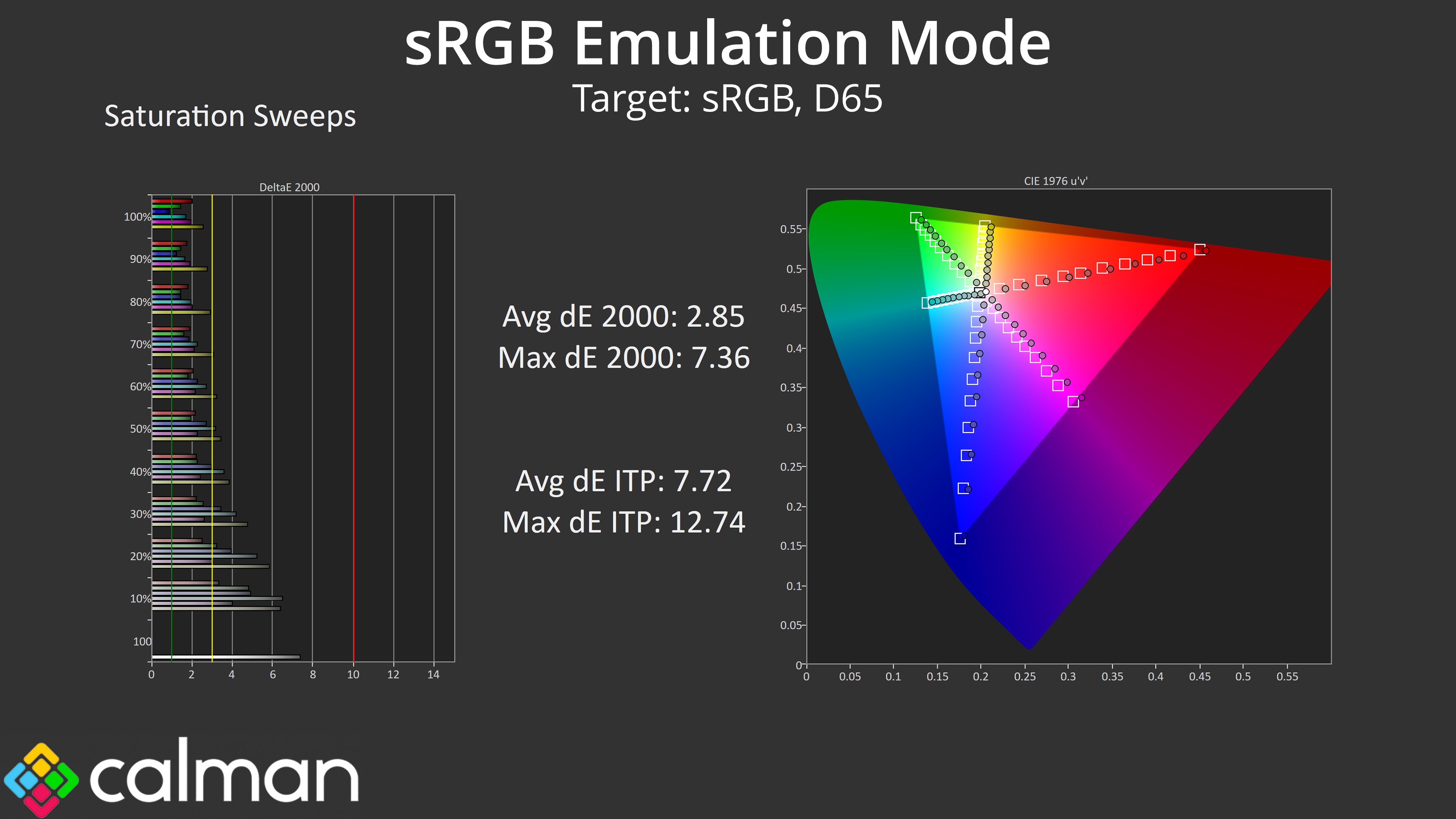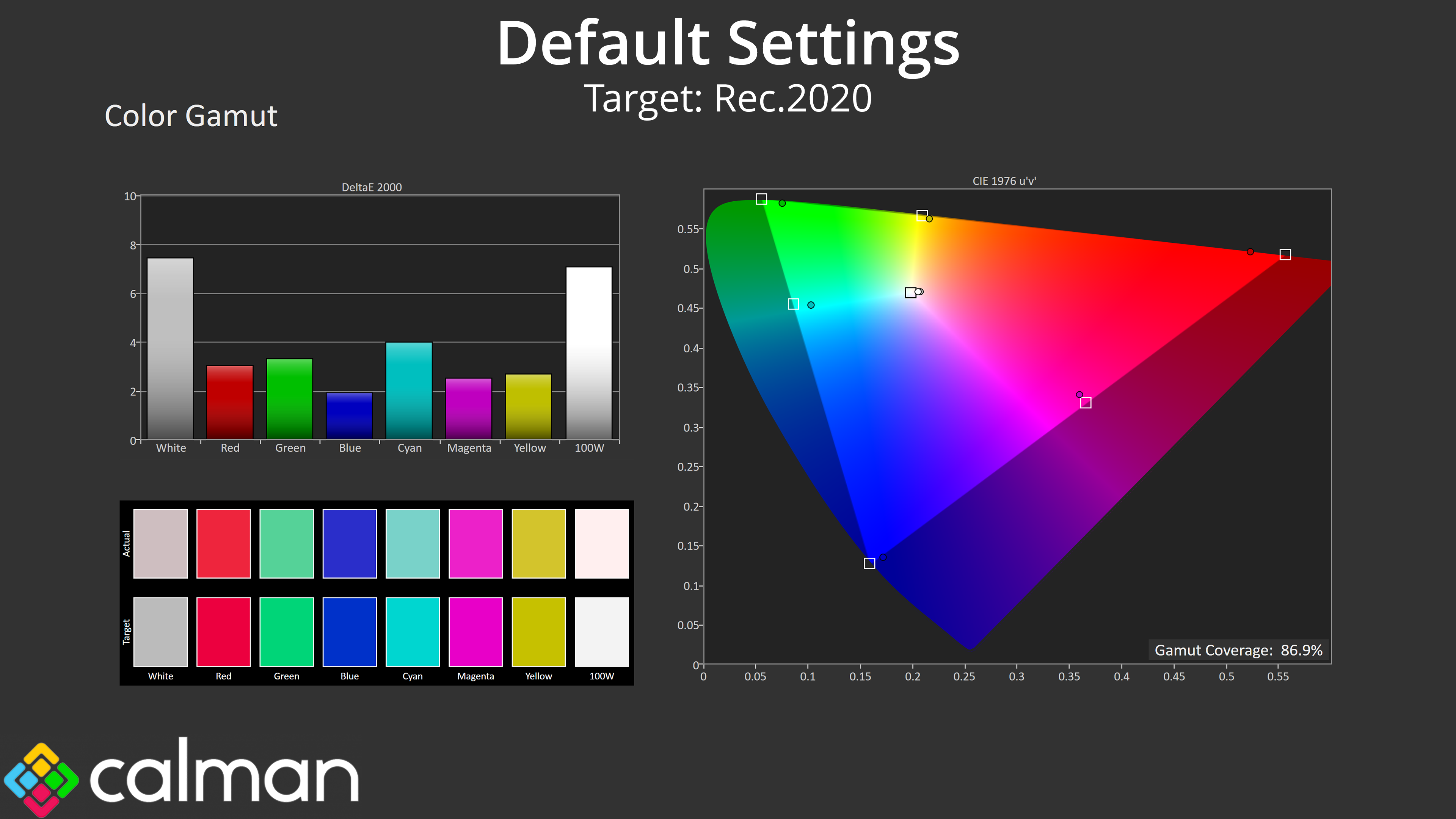 As we'd expect considering the incredibly wide gamut, there is lots of over-saturation – even relative to the DCI-P3 space, where we saw an average dE 2000 of 3.56.