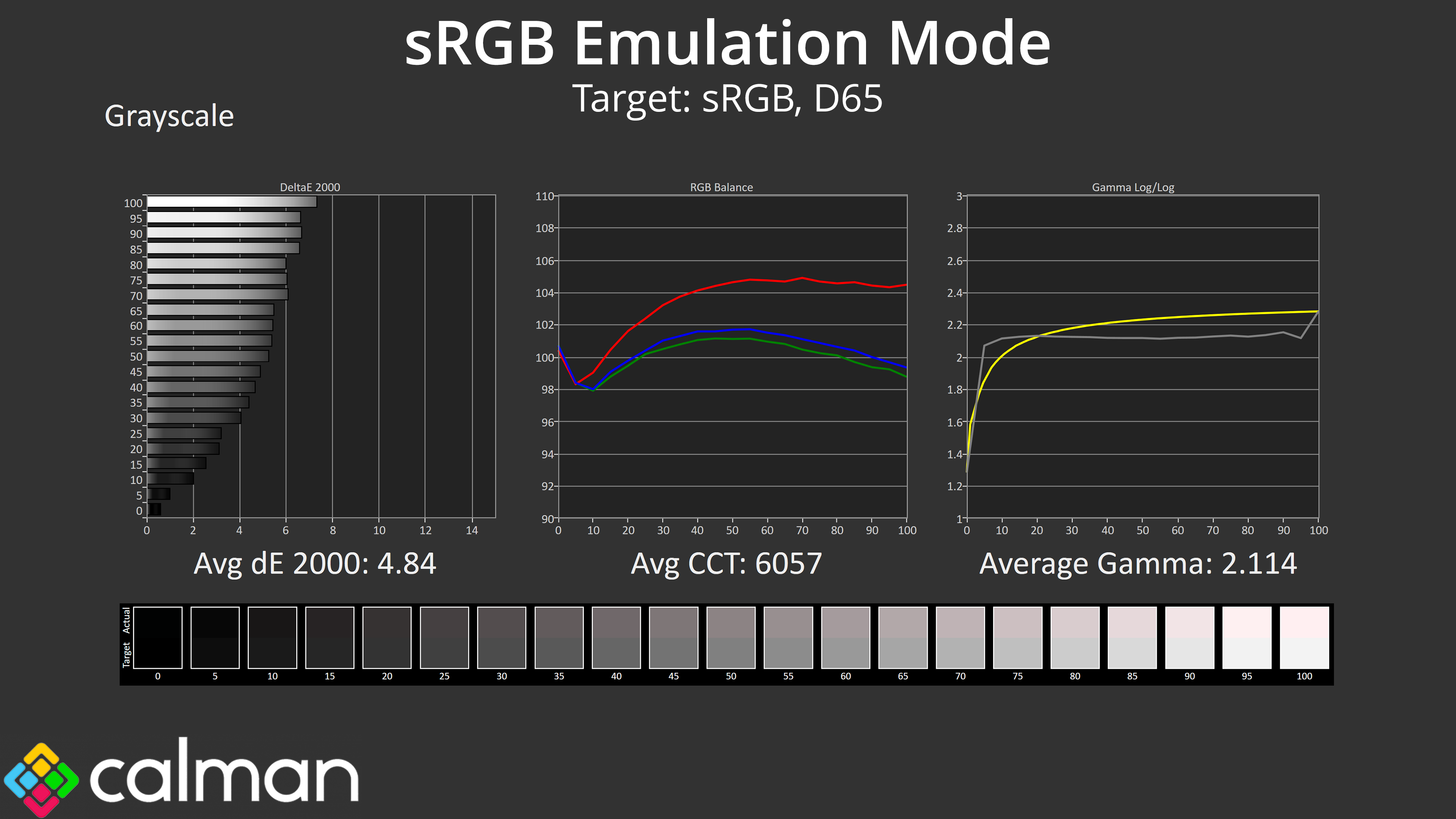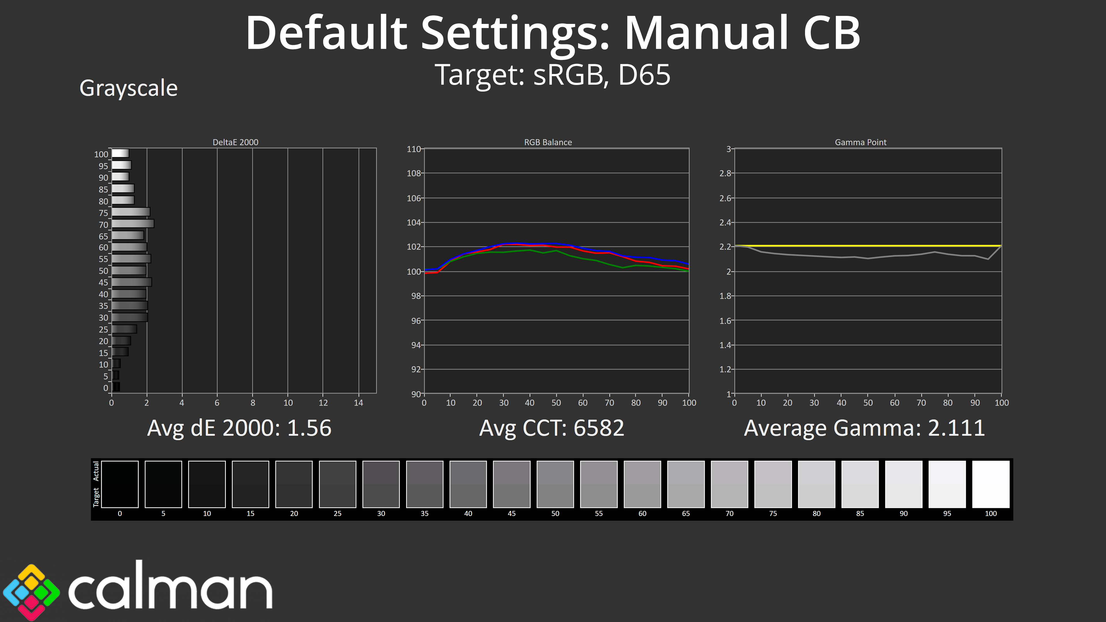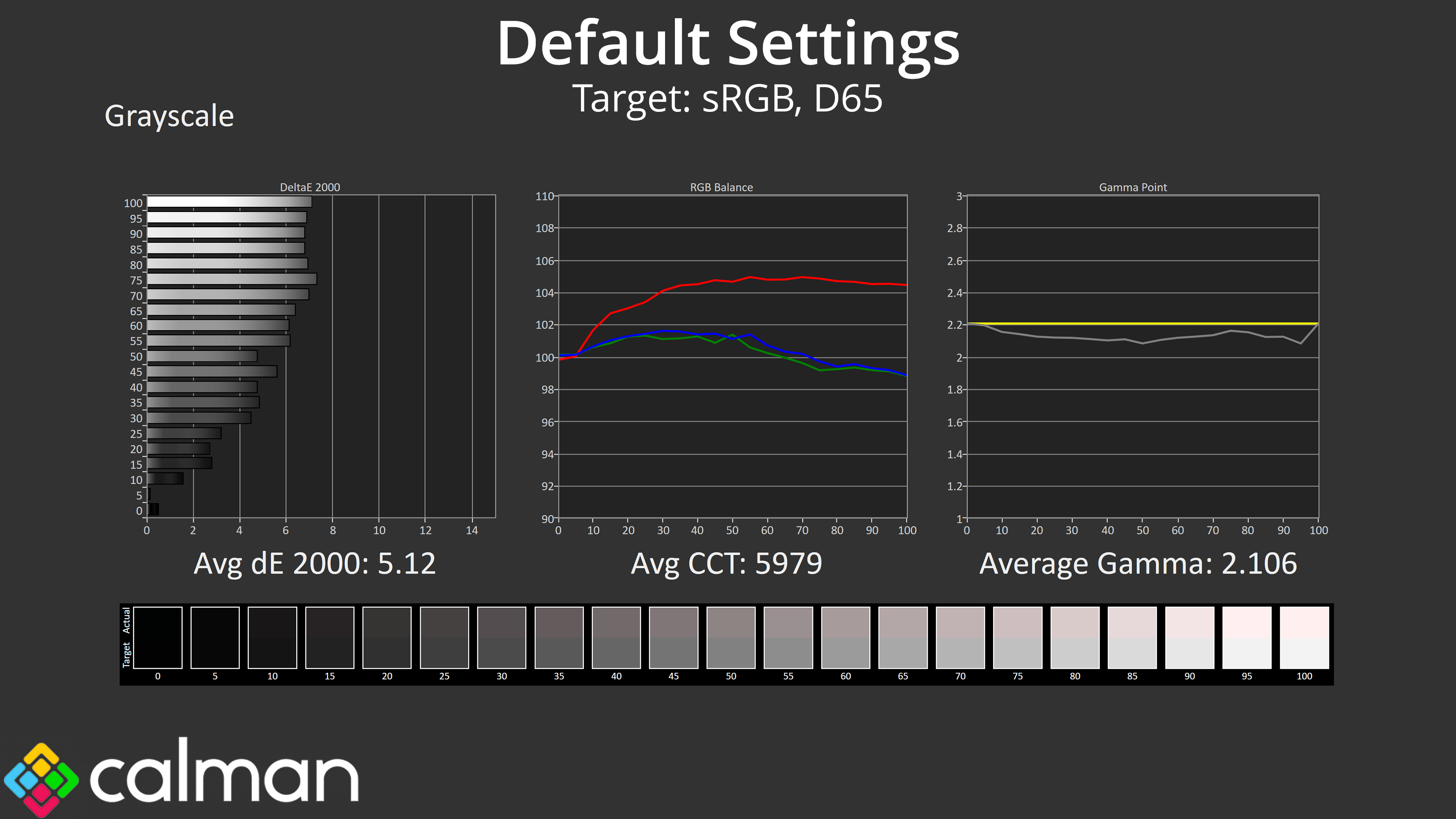 Default greyscale performance leaves a bit to be desired, however. For one, the colour balance is noticeably warm, averaging 5979K in our tests. Gamma is also a little low – not by much across the curve, but it averages 2.106, rather than the 2.2 target we are aiming for. That, but primarily the colour balance, results in the higher-than-expected average dE 2000 of 5.12.