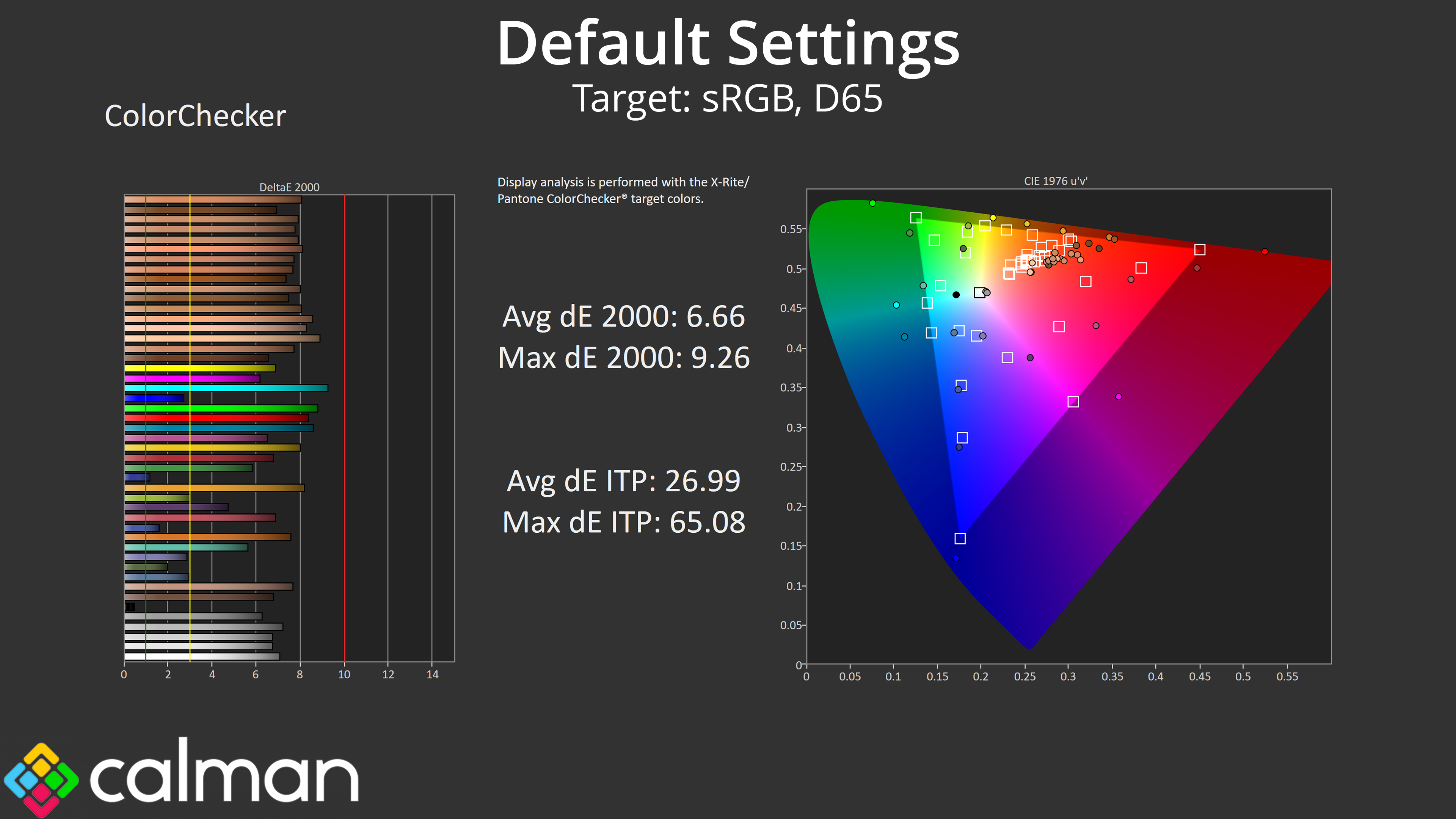 That has a knock-on effect for out of the box colour accuracy, with high average dEs on show regardless of whether we were looking at the sRGB or DCI-P3 space.