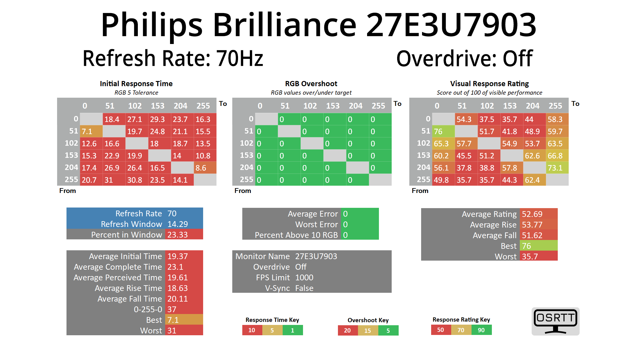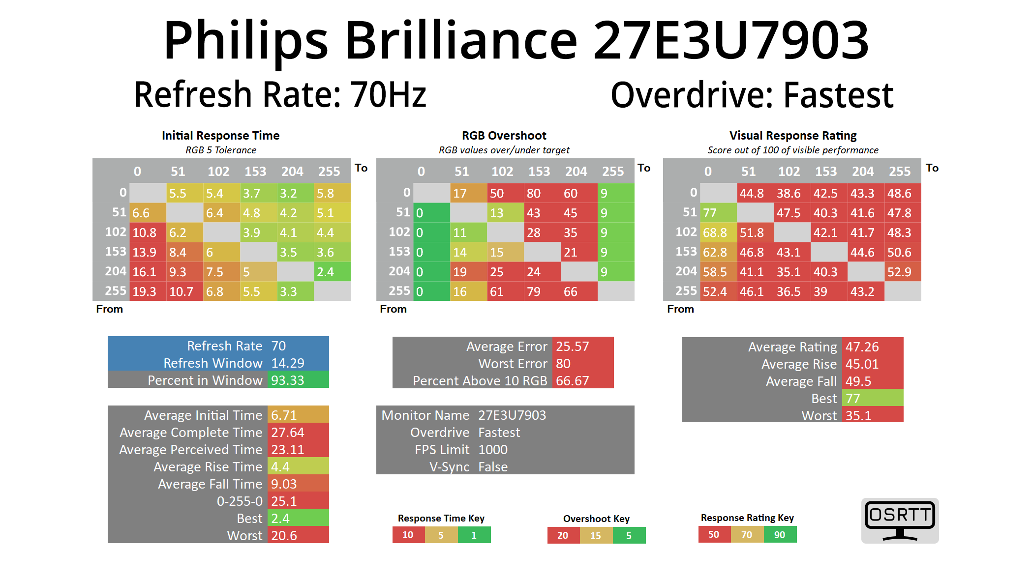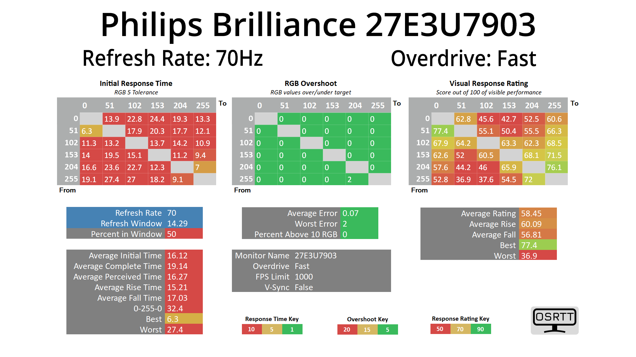 We use the Open Source Response Time Tool (OSRTT), developed by TechTeamGB, for our response time testing. This measures grey-to-grey response times and presents the results in a series of heatmaps, the style of which you may be familiar with from other reviews.