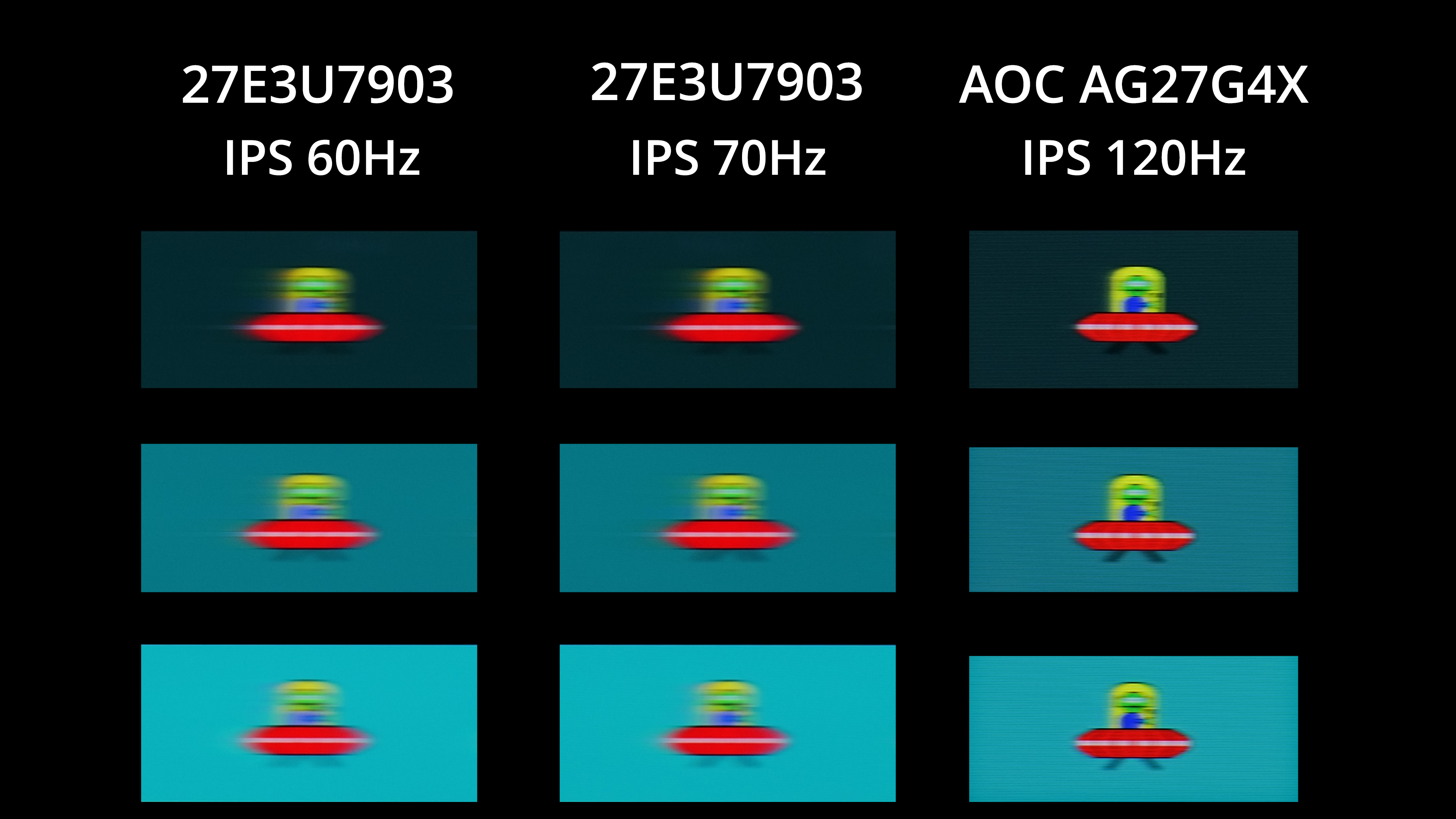 As you can see, there is a fair amount of motion blur visible from the 27E3U7903, while running it at 60 or 70Hz doesn't make much difference in the real world. Clearly, an IPS panel running at 120Hz looks substantially clearer. Of course, you can argue as to whether or not a professional screen like this needs a refresh above 60/70Hz, and it may not be a factor for many considering this type of screen. Most pro-grade screens that offer a 120Hz refresh rate will be significantly more expensive, too, but we thought it was worth including the comparison so you can make your own decision.