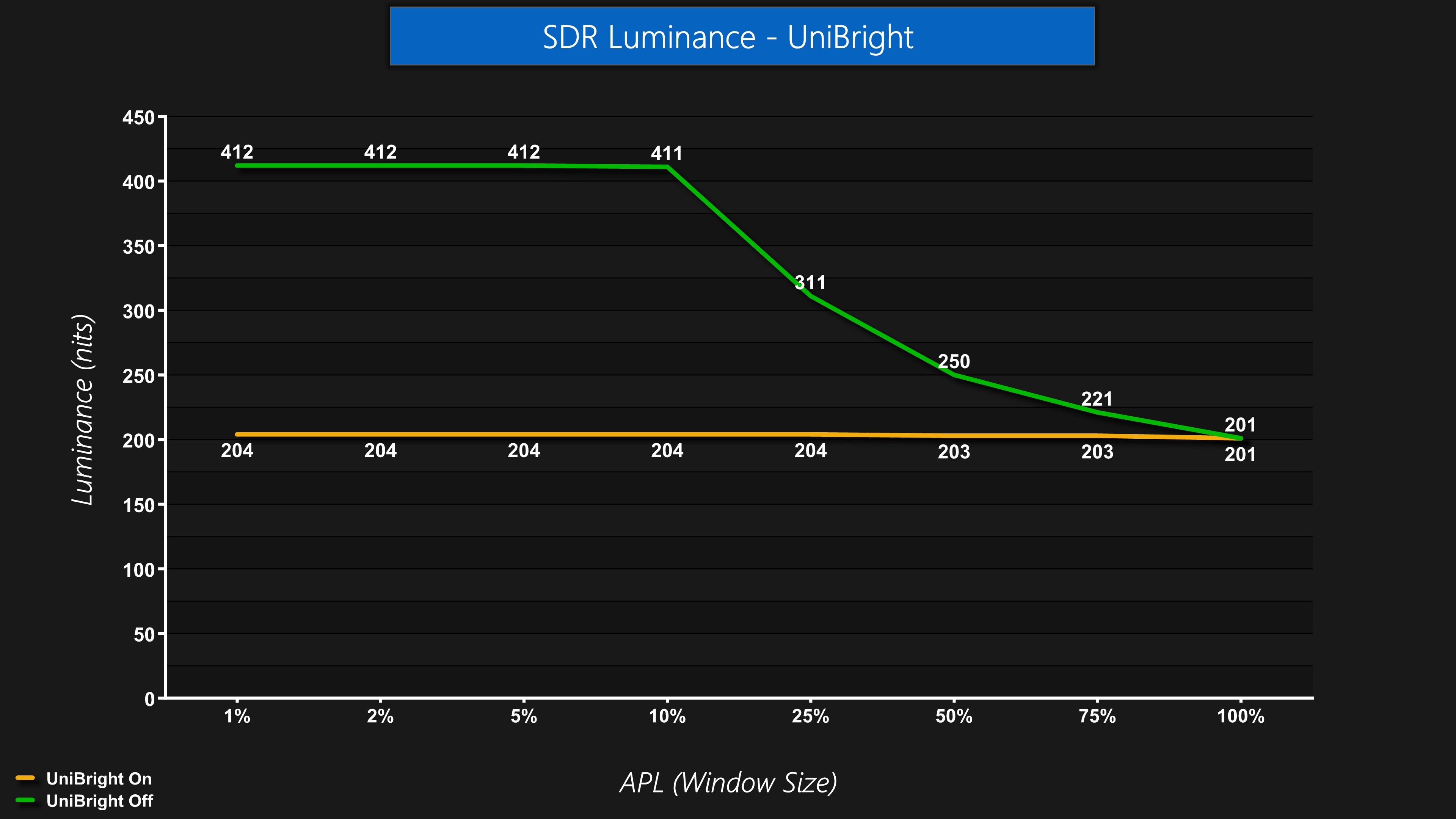 By default, output luminance is completely steady regardless of APL, or window size, and this is thanks to the ‘UniBright' setting, actually found within the OLED Panel Care sub-menu. You can disable this which will let you achieve higher peak brightness for smaller window sizes, but that results in noticeable dimming as the window size increases. It's good to have the option, though, so users can adjust to their preference.