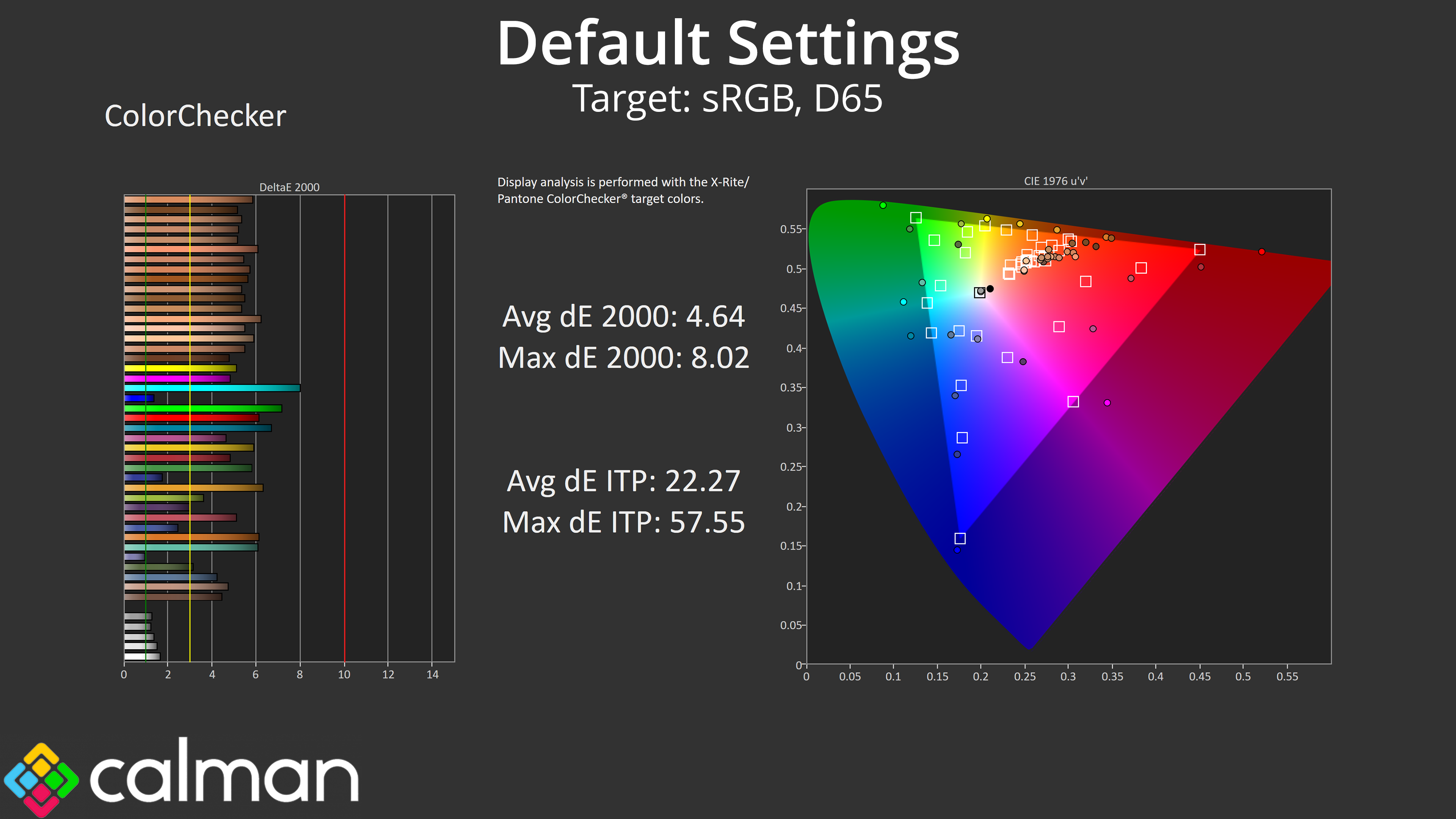 We first run these tests with the display in its out-of-the-box state, with all settings on default. If there is an sRGB emulation option or other useful mode then we may test that too. We then calibrate the screen using the Calman Ultimate software and run the tests again.