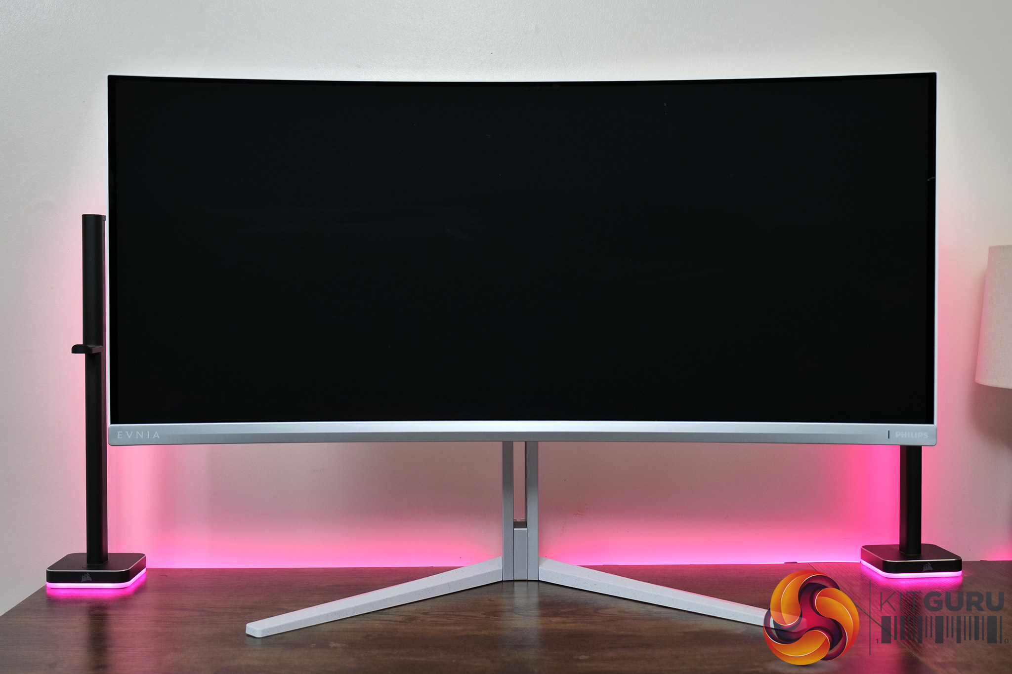 If you've seen any other Evnia products before, you will know that the company does things a little differently. Instead of an all-black aesthetic, the 34M2C8600 is rather eye-catching with its white and silver design. The base of the stand and the rear of the display are matte white, while the front bezel and stand are silver. The v-shaped foot even features some coloured speckles giving this quite a unique appearance.