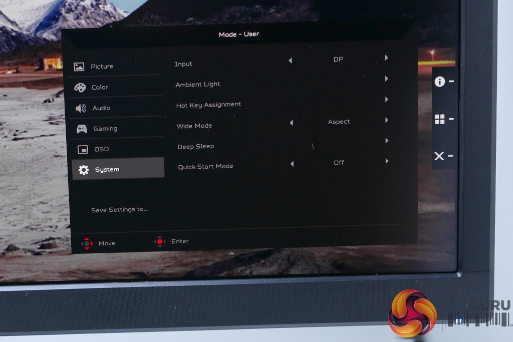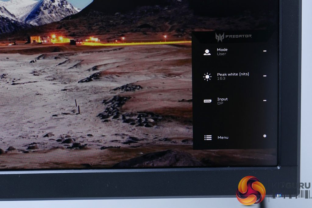 Press any of the buttons – other than the power button that sits at the top of the row – and it’ll bring up a quick menu that lets you jump into one of four sub menus. Tap in the joystick and you’ll enter the main menu or hit the top button and it’ll bring up a screen modes menu. The next button down takes you straight to brightness adjustment while the third button is for the input menu. You can also change the assignment of these hotkeys.