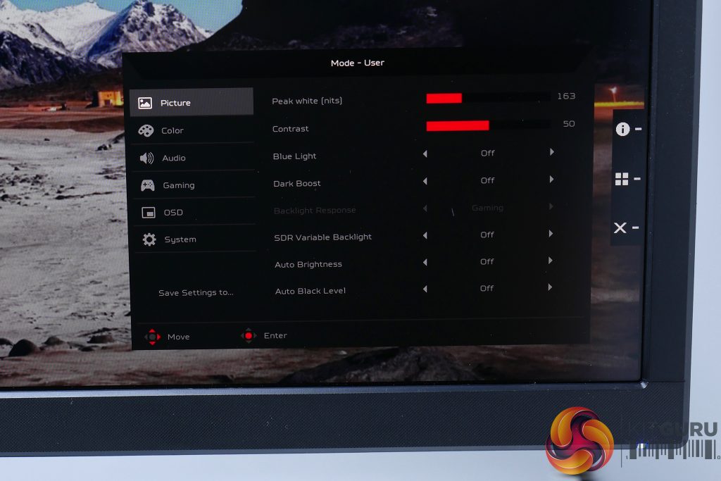 One thing that’s notable about the brightness option – here called Peak white – is that its level is displayed in the light measurement, Nits, and that the figures Acer says in the OSD correspond exactly to our measured brightness. Right the way from its minimum value of 50nits up to its maximum of 400nits, it was within a few nits of our measured output.