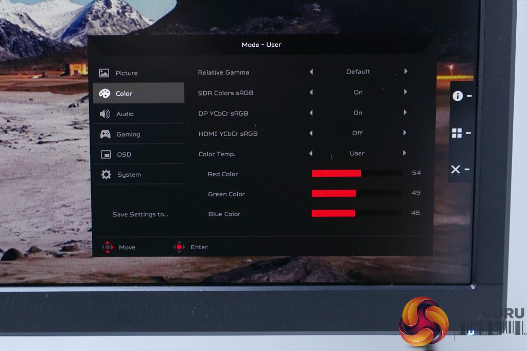 Move into the Color menu and as well as core settings such as gamma and colour balance there’s one crucial setting you’ll want to experiment with, which is SDR Colors sRGB. This controls whether the display uses its extended colour gamut when it’s only being fed standard sRGB colours.
