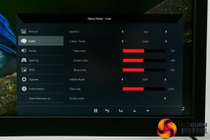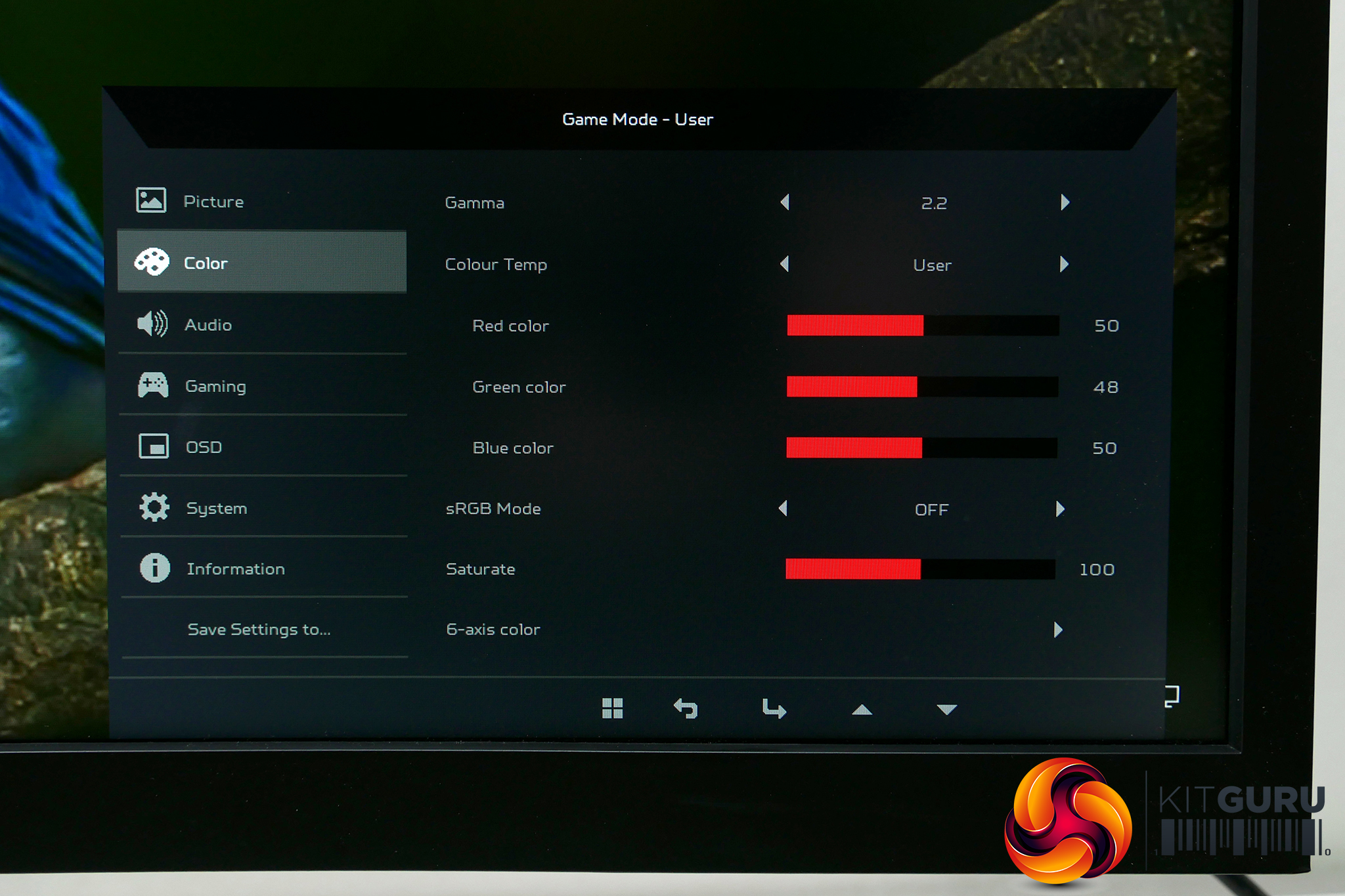 Move onto the Color tab and here we get options for the gamma curve, the colour temperature, sRGB mode, colour saturation and 6-axis color balance that provides yellow, magenta and cyan colour balance options to go along with the more typical red, green and blue options.