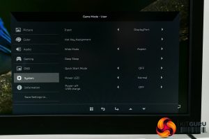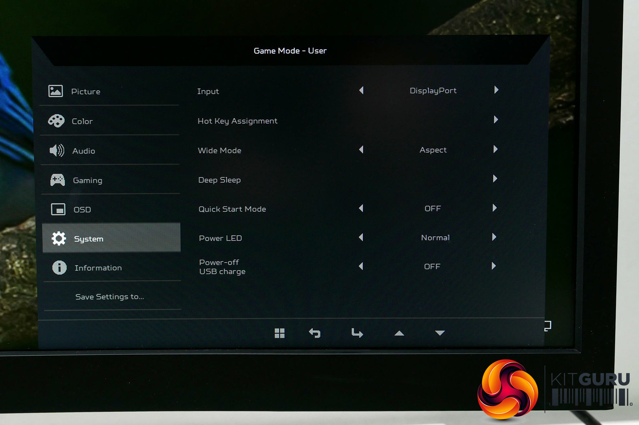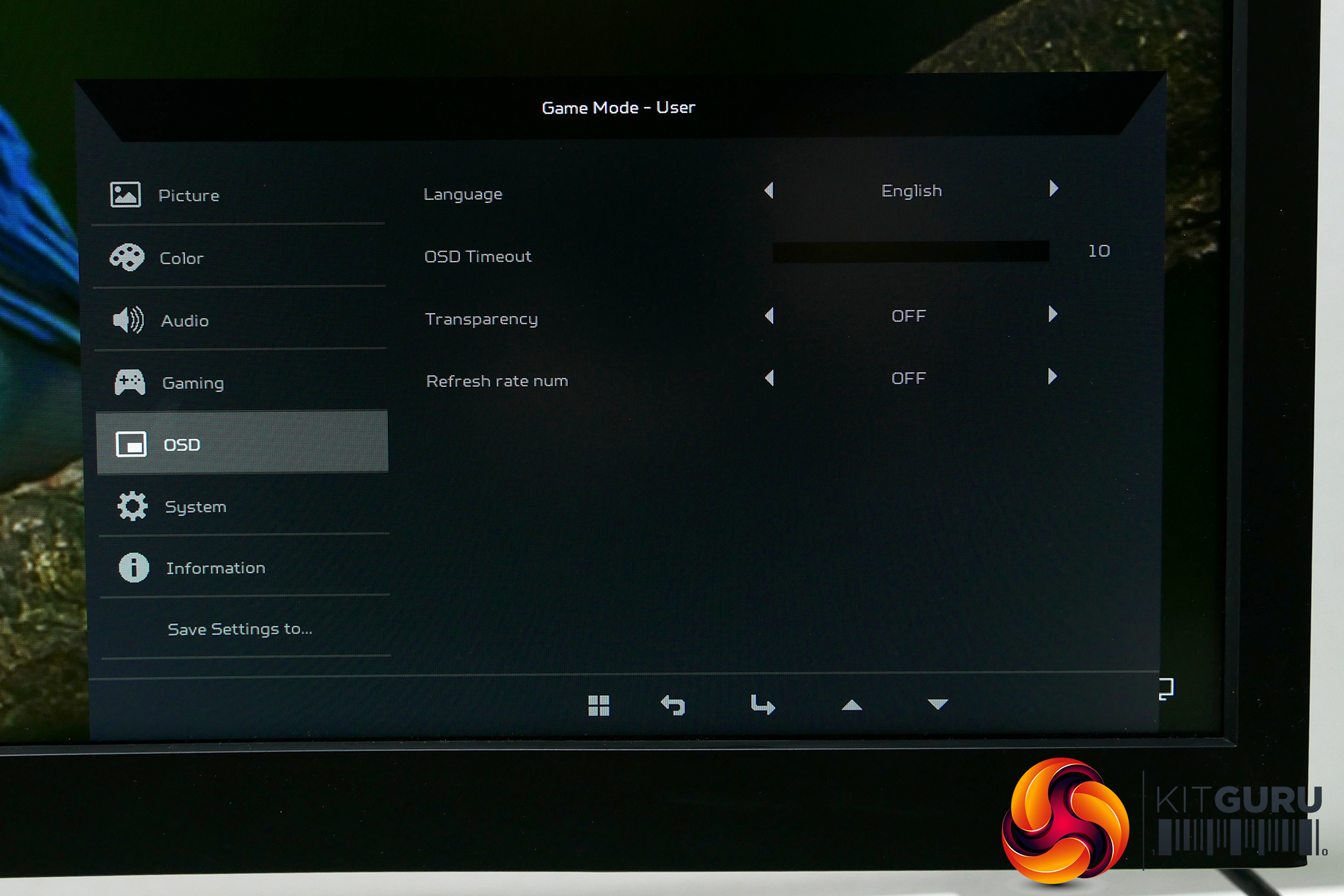 The OSD tab lets you change the language of the OSD, the timeout for it, as well as the transparency. System has optoins to change the input and aspect ratio as well as change the sleep mode and turn off the LED that illuminates the power button. Finally, the Information tab shows what resolution and refresh rate the display is running at as well as whether G-Sync is on.