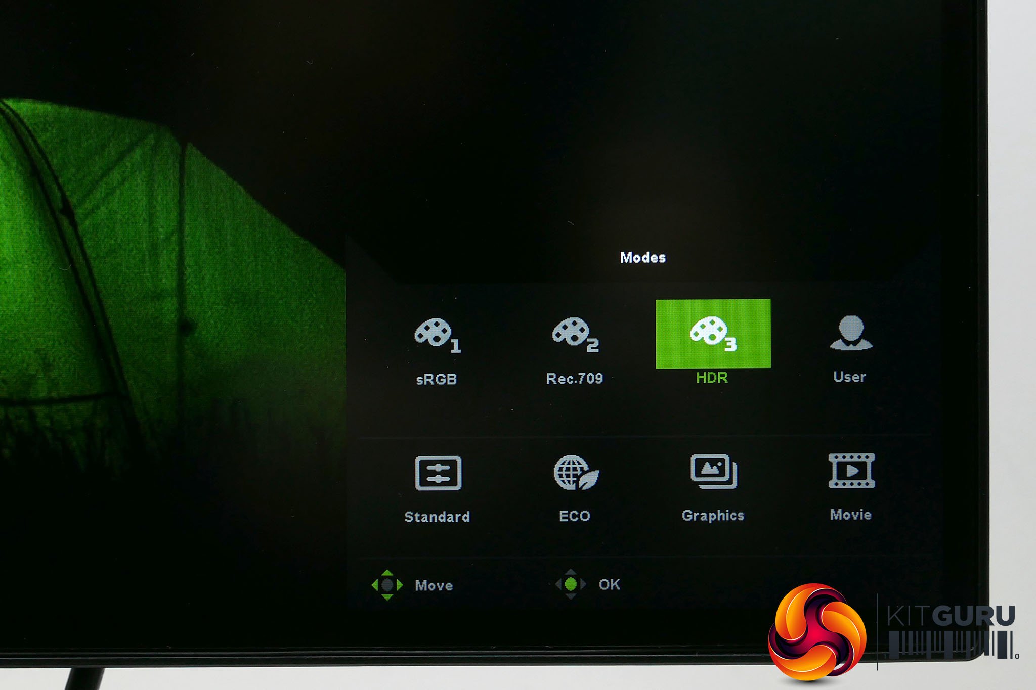 Starting with the Modes menu, you get eight options, including an Eco and Movie mode. However, the main four are sRGB, Rec.709, HDR and Standard/User. The sRGB mode is designed to limit the expanded colour range of this display to the standard sRGB range. It’s this mode that you’d choose for all normal use and particularly for if you’re working in a professional capacity on sRGB images. The Rec.709 option is the same thing but for the Rec.709 colour space.