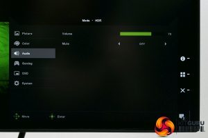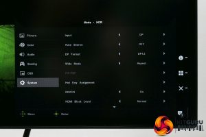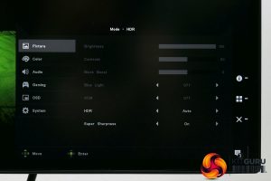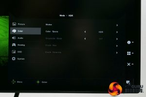 Tap the joystick once and you get the top level menu that provides quick access to four sub menus, which are accessed by pressing one of the buttons or the joystick again. The menu first lets you change what mode the display is in: HDR, sRGB, etc. The second menu is just a shortcut to brightness adjustment, the third provides input options and the fourth takes you into the main menu.