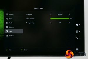 And what a comprehensive selection of them you get. Thankfully the layout makes it easy to work out where the setting you require is located. Picture deals with everything brightness and contrast related, Color provides various colour modes as well as manual colour balance adjustment, Audio gives you volume and mute, OSD lets you change the language, timeout and transparency of the menu and System has things like input options.