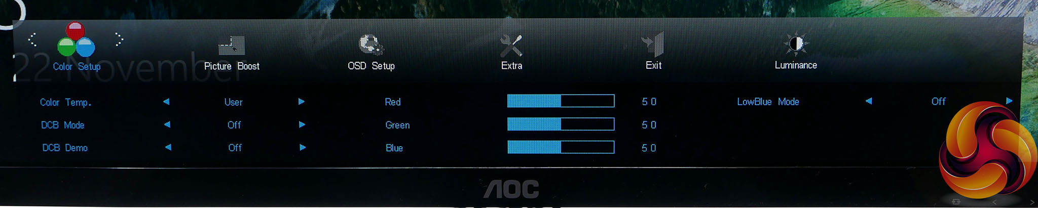 Next up is Color Setup where you can choose the colour temperature (Warm, Normal, Cool, sRGB, User), alter the RGB colour balance and enable low blue light mode.