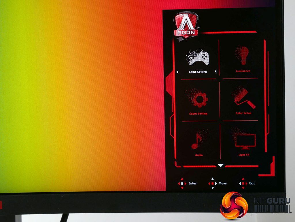 Starting from the top, tap the joystick in and the main menu appears. This consists of a grid of eight options: Game Setting, Luminance, Gsync Setting, Color Setup, Audio, Light FX, Extra and OSD Setup.
