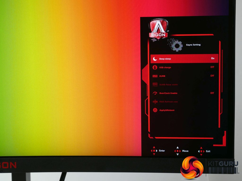 Next up is the Gsync menu. This is a slightly odd one as most of the settings aren’t to do with Gsync. You can overclock the display from its default of 144Hz to 165Hz, turn on USB charging (keeps the ports on when the display is off) and turn on ULMB mode.