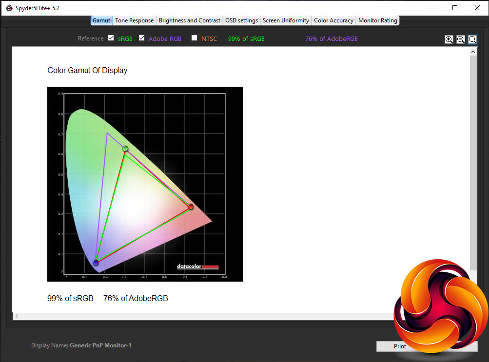 Moving onto our Spyder5Elite colorimeter and software, we next tested the colour space coverage, or gamut, of the display. For a display of this type we’d expect it to cover up to 100% of the sRGB gamut and around 75% of the AdobeRGB gamut, which is almost exactly the result we got.