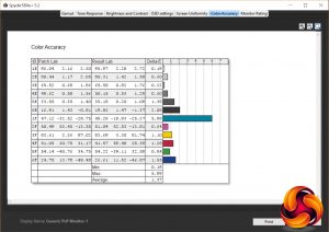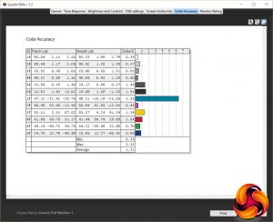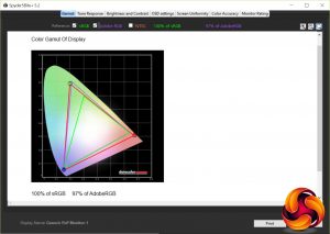 The first test that the colorimeter performs checks for how much of the various standard colour spaces the monitor can cover and the PG27UQ falls a touch short of 100% of the sRGB colour space and hits 77% of the AdobeRGB space. We’d expect this display to hit 100% sRGB in this test but 96% is definitely close enough to not be a concern.