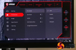 Moving down to the Professional menu options and here you find a rather motley selection. Again there’s Anti Motion Blur plus there’s a high dynamic range setting (HDCR) that varies the backlight brightness in accordance with what’s onscreen (that’s how MSI claims a ludicrous 100,000,000:1 dynamic contrast) and an Eye Saver option that reduces the blue light level to make for an image that’s easier on the eyes.