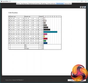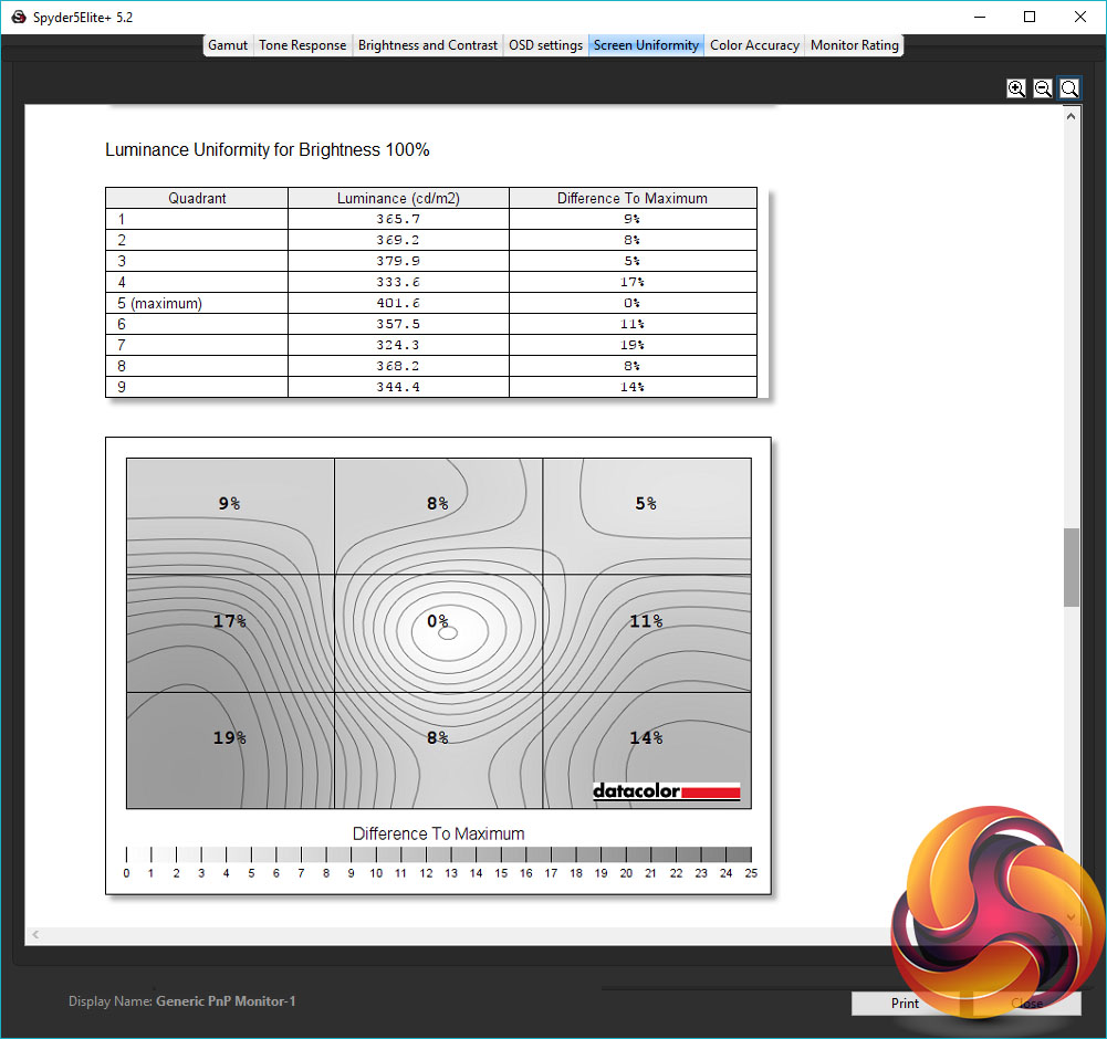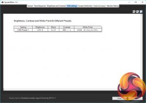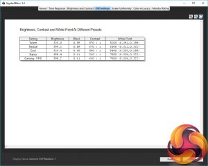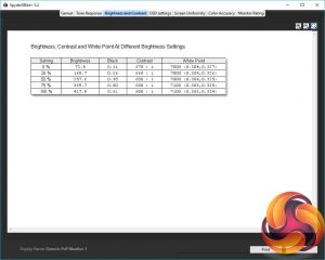 The Spyder Brightness and Contrast test checks for the white and black brightness levels as you change the display’s brightness settings from 0-100 (or equivalent). We ignore the contrast as this is under-reported but we can see from the brightness test that the monitor’s brightness settings provide a nice range of values, topping out at an impressive 418nits and dropping steadily down to 73nits. The colour balance also stays reasonably consistent as the brightness changes.