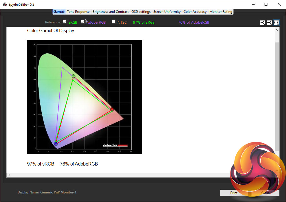 Next we moved on to our Spyder5 tests, and the first routine it performs checks for how much of the various standard sRGB and AdobeRGB colour spaces the monitor can cover – sRGB is what matters for a display of this type. The Omen by HP 27 puts in a decent performance, delivering a 97% sRGB coverage rating.