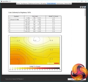 The uniformity tests are up next. These check to see how consistent the brightness and colour reproduction is across the full surface of the screen. At 100% brightness this display varies by an average of 9% and peaks at 19% variance. That’s not awful but not amazing either.