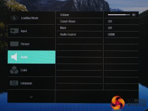 Audio provides the volume control as well as an option to totally mute the display, select which source is playing and turn on stand-alone mode, which enables audio output when there’s no video feed.