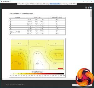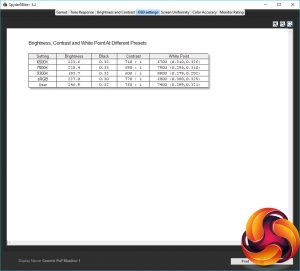 Next up is the Spyder5 tests for contrast and white point at the various different colour settings available through the display’s OSD. Here we can see that the default 6500K setting provides a white point that is very close to what’s required, while the 7300K and 9300K settings are also reasonably close to what they should be – the higher the colour temperature the more blue the image appears.