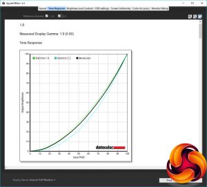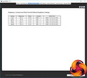 The Spyder5’s brightness and contrast test again shows the same low maximum brightness as the Xrite colorimeter, but does also show a nicely consistent white point colour temperature at various brightness levels. In other words, if you change the brightness the colour balance of the image doesn’t change. We ignore the contrast ratios in this test as the Spyder5 under-reports these.