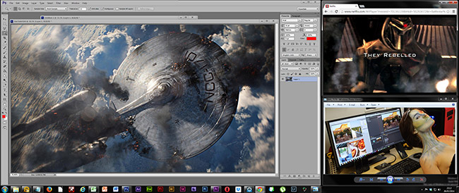 Running something like a 1920×1080 screen on the left, with the remaining 640×1080 on the right. If you want to edit a full HD image in Photoshop while catching up with Battlestar Galactica and searching through images for your next edit, this is perfect – see example below - Full Screen