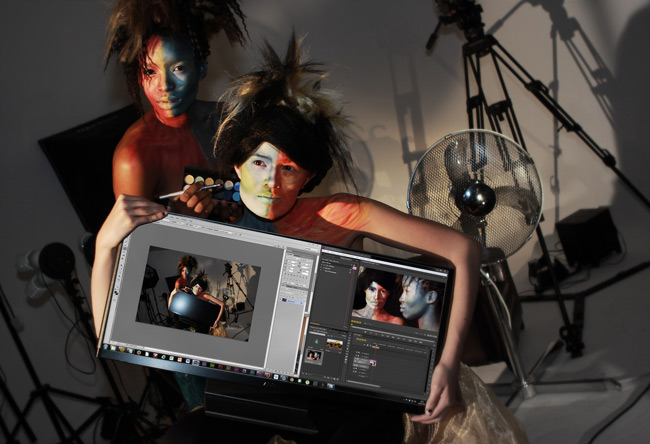 We thought it might help you visualise the width of the AOC's landscape if you saw it next to regular sized humans. In this shot, Storm applies to the finishing touches to her friend's make up, while Yaz grips the 29″ AOC monster in an artistic way.