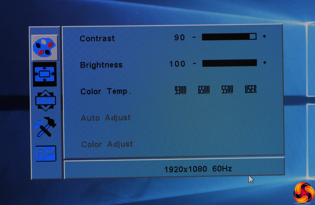 Pushing the joystick left doesn't do anything, so your final option is to push it right, which calls up the main menu. The first portion of this to appear is the colour section, and it's not exactly full of options. You can adjust contrast, brightness and colour temperature. The latter provides 9300K, 6500K and 5500K options, plus a User mode that enables direct adjustment of RGB values.