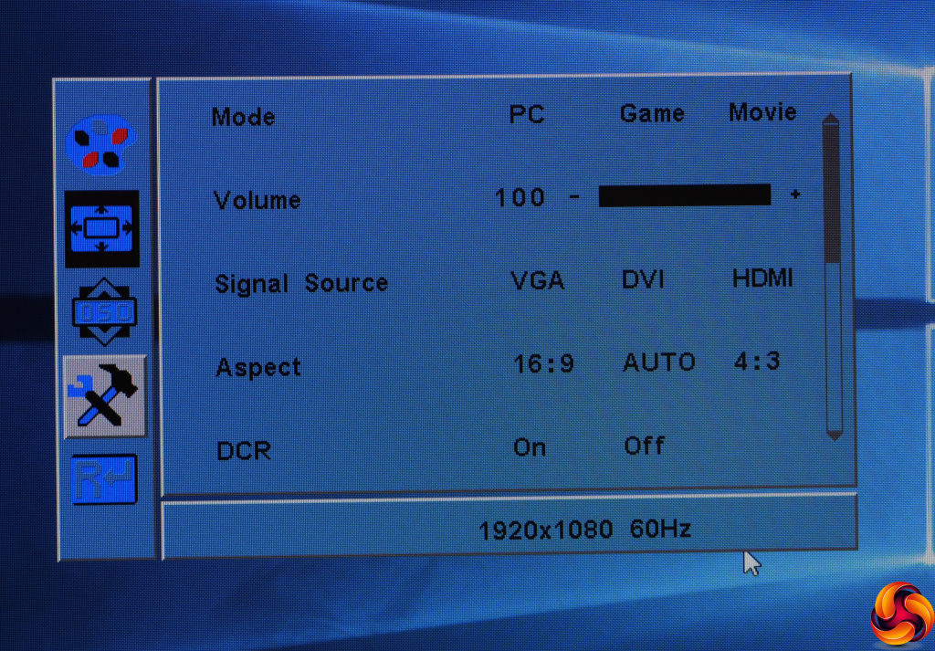 Next along is a setup option where you can invoke the PC, Game and Movie presets, adjust the speaker volume (again), select the video signal source manually (again), force an aspect ratio, and enable dynamic contrast to provide the ludicrous values mentioned in the specification. This works by raising and lowering the backlight to provide a greater perceived contrast than the screen pixels themselves can provide.