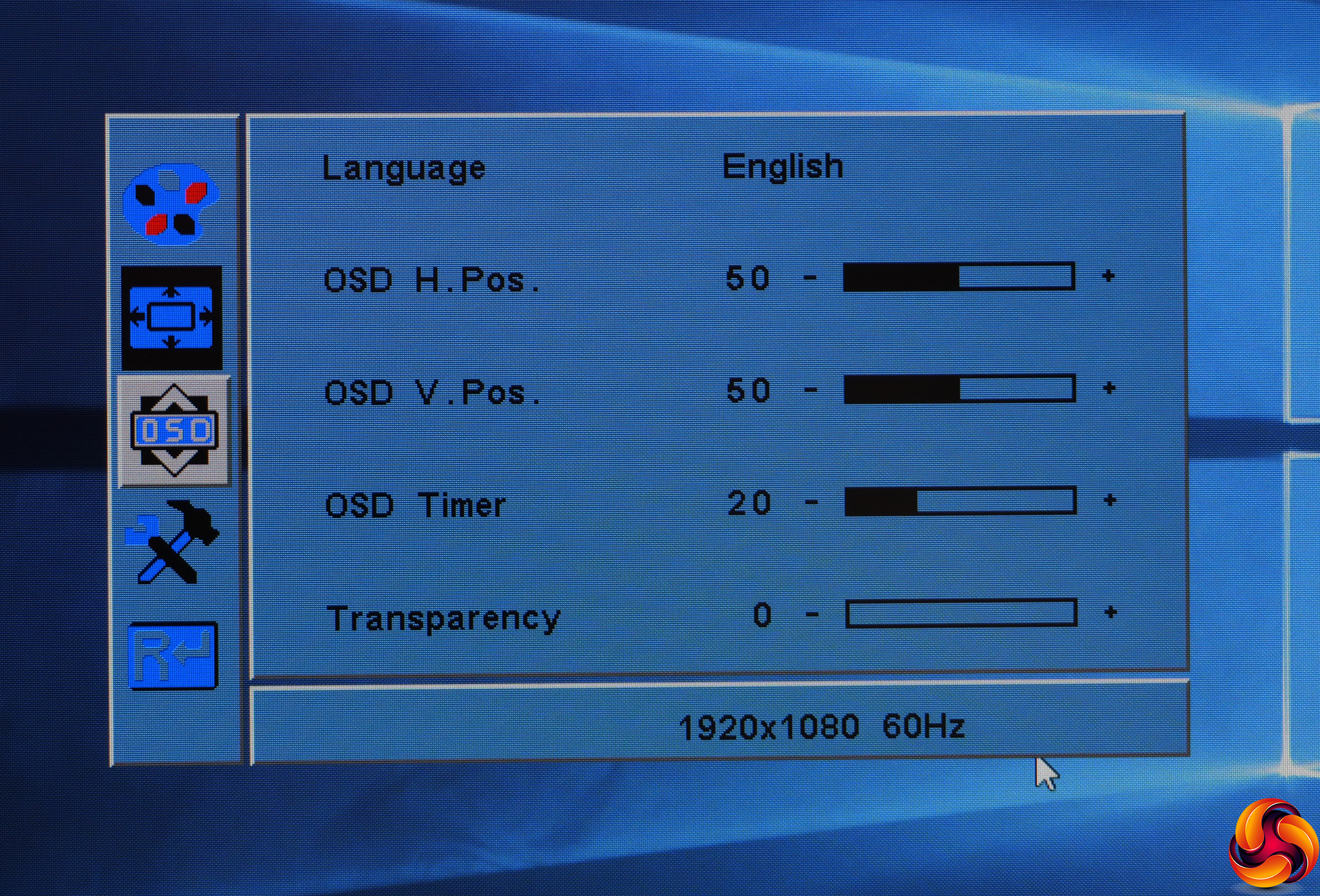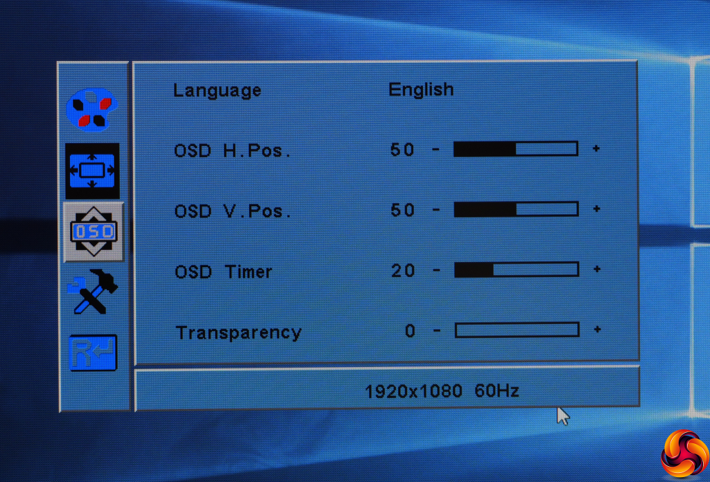 The next menu option is for positioning an analog signal, which we weren't using, so we move directly to the next one after that, which controls the positioning and transparency of the OSD.