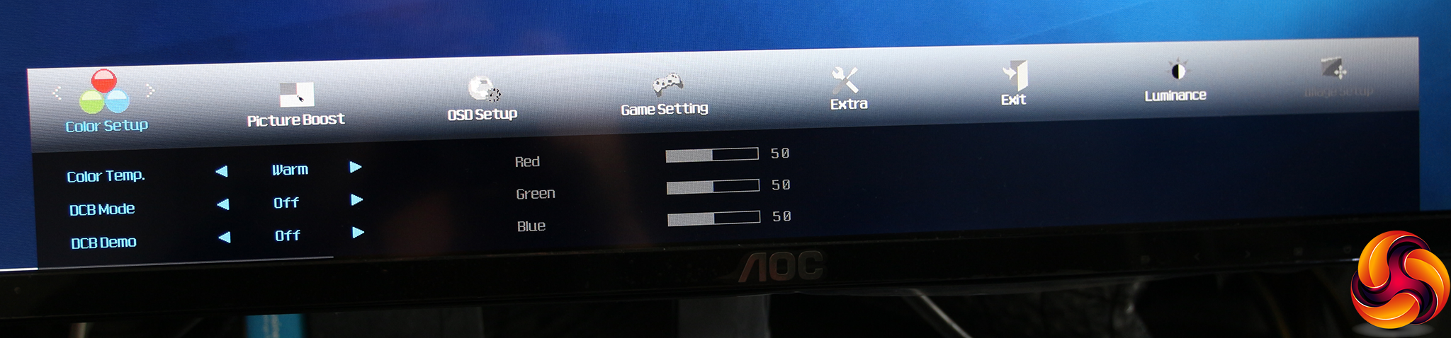 The Image Setup page isn't available with a digital input, only VGA, so the next page along is Color Setup. This provides Warm, Normal, Cool, sRGB and User colour modes. The latter allows direct control over RGB levels.