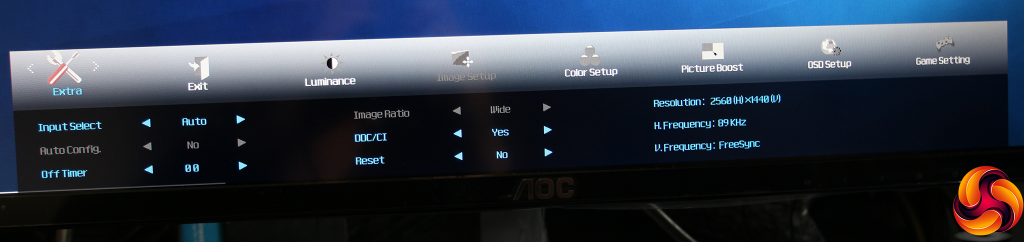 Finally, in the Extra section, all the options that don't fit elsewhere can be found, like resetting to factory defaults and configuring whether the screen auto-detects inputs. Strangely, although this page shows you the current screen resolution and whether FreeSync is enabled, there doesn't appear to be any way to disable the latter.