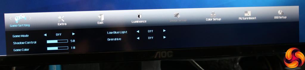On the Game Setting page, you can choose one of the presets. This mostly sets the Overdrive mode, which is a system for speeding up pixel response at the expense of image quality, and could be handy considering the base 5ms specification in this area. With the presets, the other options are greyed out apart from Low Blue Light, which is a setting you can use to reduce eye strain.