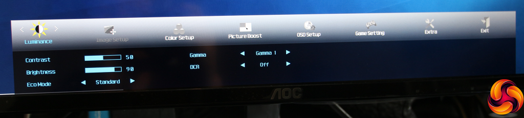 The fourth button from the left calls up the main menu, which is entirely different in appearance to the quick menus. The default page of the main menu is Luminance, where you can control Contrast, Brightness, Gamma, DCR mode and Eco Mode.