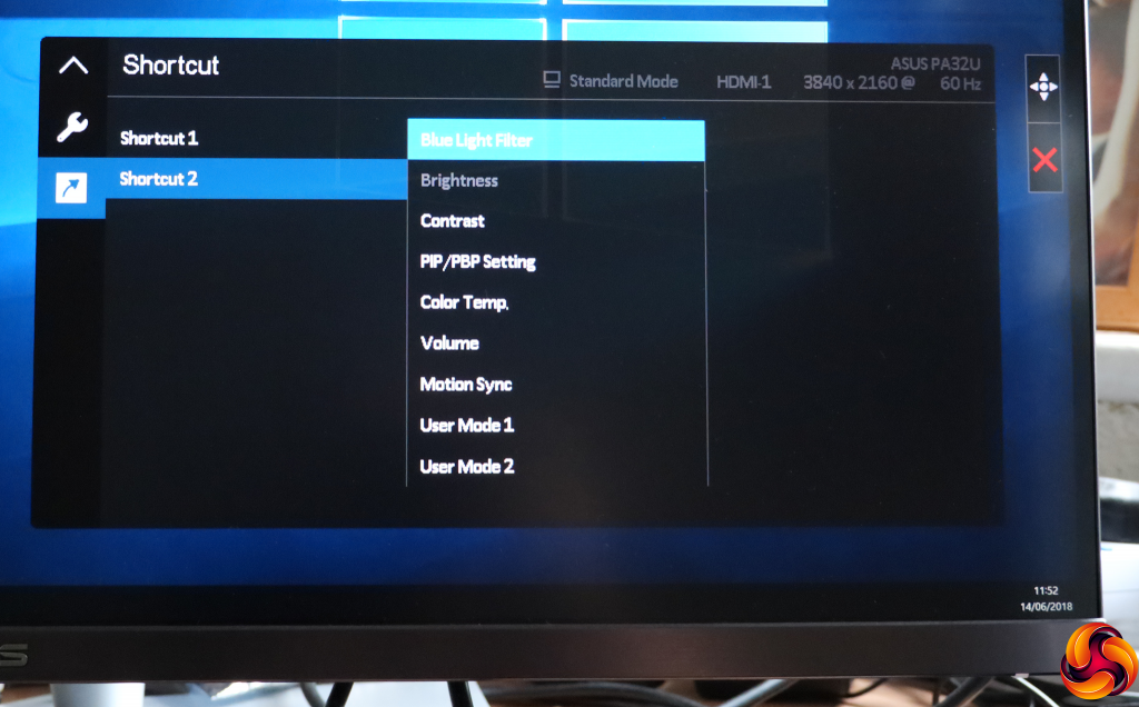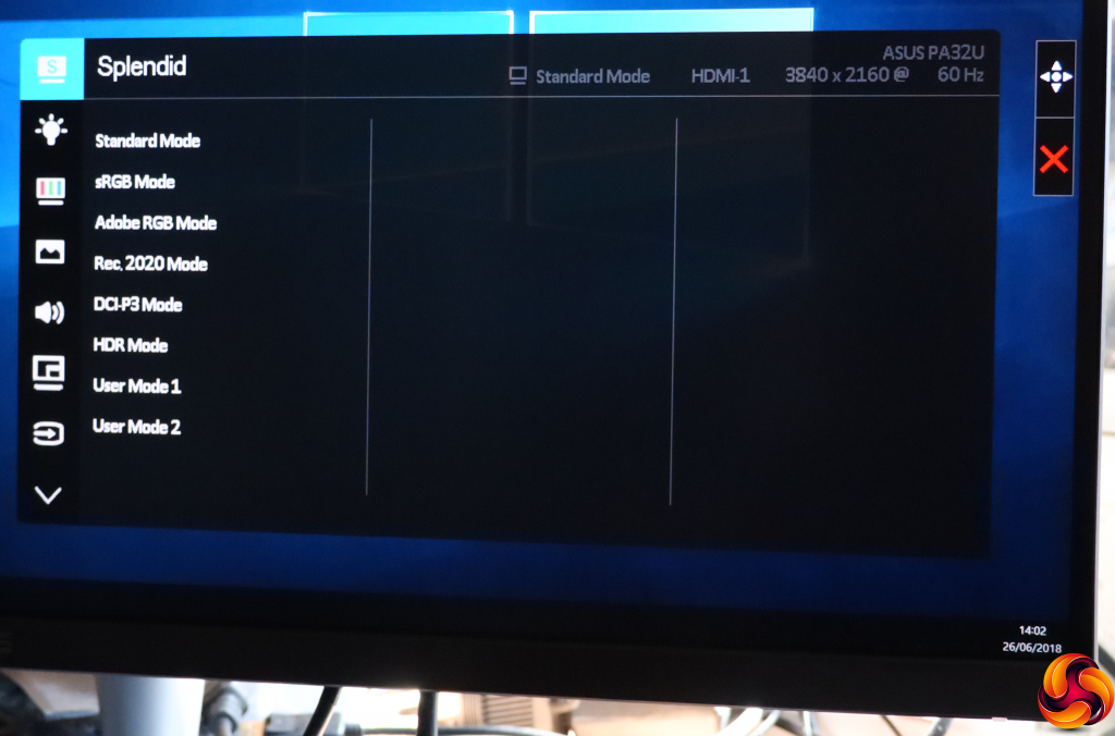 Pushing the joystick in with the quick menu visible gets you to the full menu, and the first part of it is the Splendid section, which is ASUS-speak for presets. These include Standard, sRGB, Adobe RGB, Rec.2020, DCI-P3, HDR, and two user-configurable options. No gaming, movie or office work modes are in evidence.