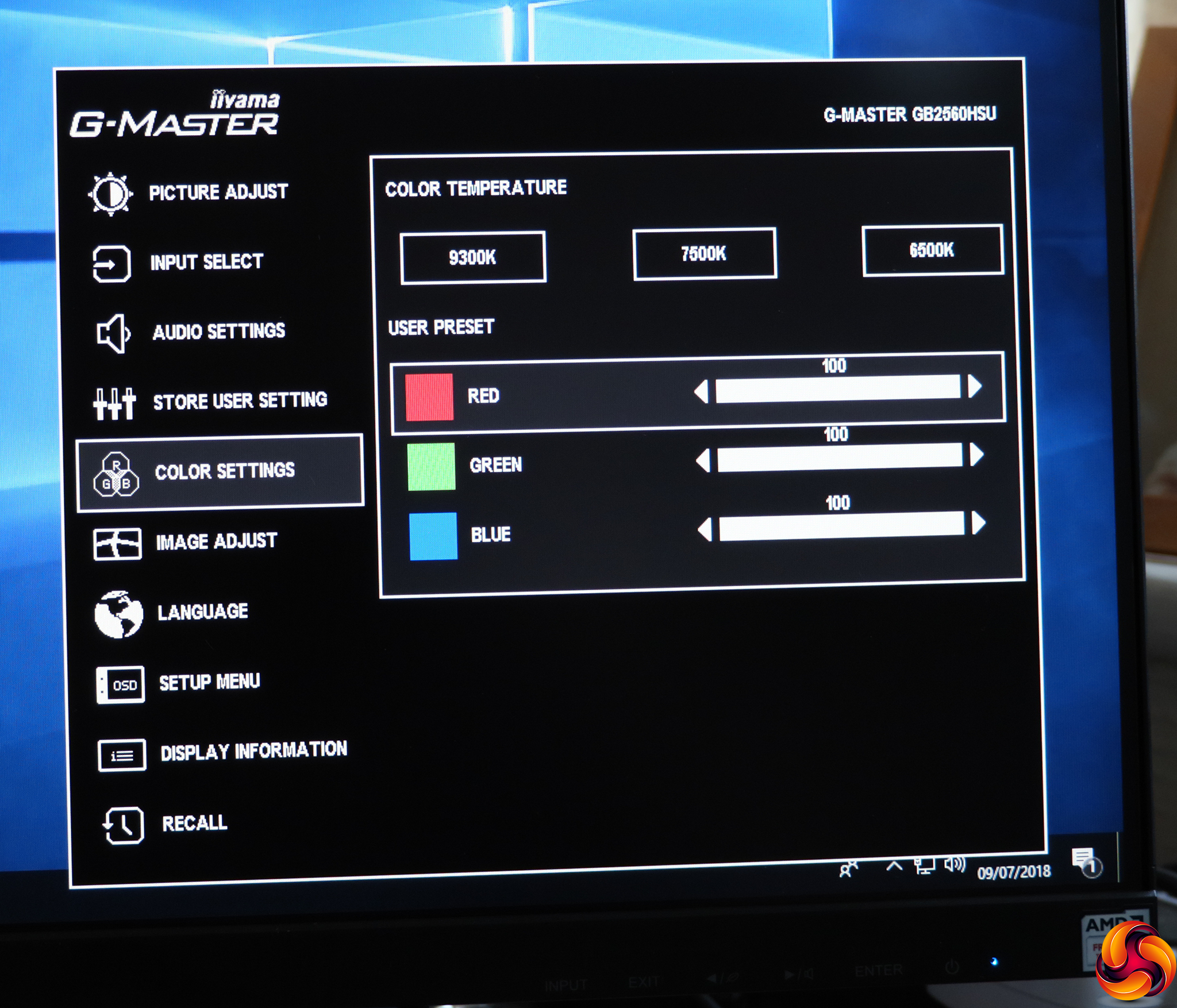 The Color Settings aren't as extensive as you might have expected. There are three temperature presets – 9300K, 7500K, and 6500K – plus the ability to adjust red, green and blue separately.
